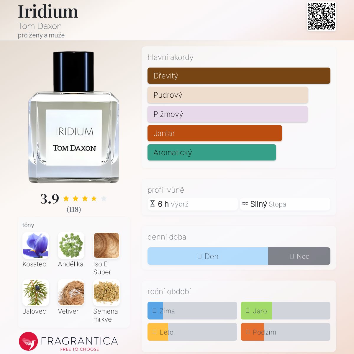 Iridium podle Tom Daxon je Floral Woody Musk vůně pro ženy a muže. Iridium byl/a uveden/a v roce 2013. Vrchní tóny jsou Andělika, Jalovec a Semena mrkve; střední tón jeKosatec ; základní tóny jsou Iso E Super, Vetiver a Cedr.