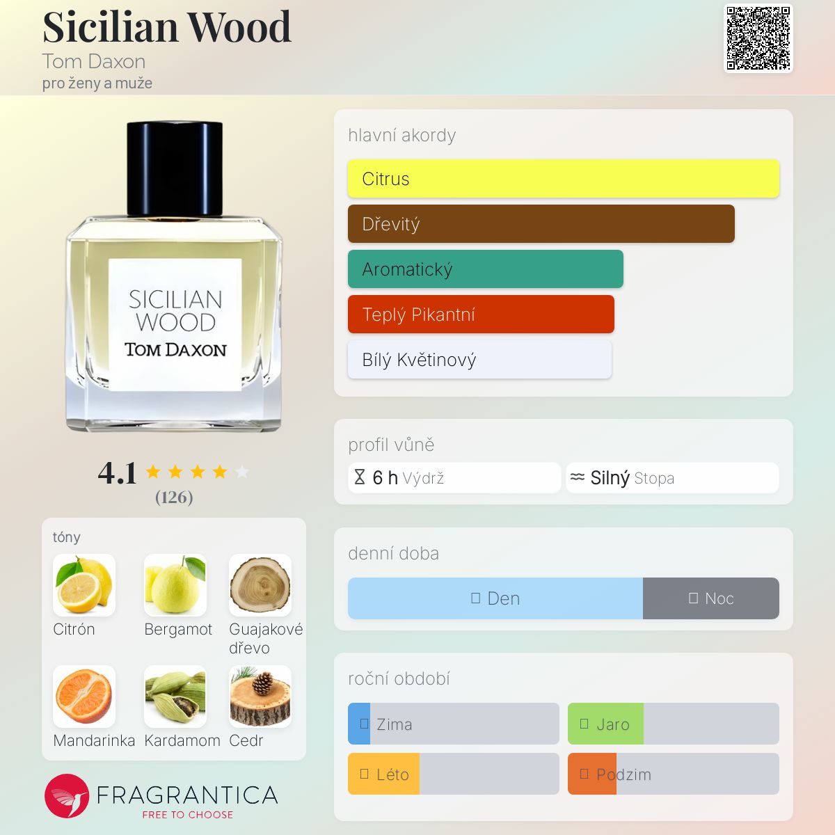 Sicilian Wood podle Tom Daxon je Woody Aromatic vůně pro ženy a muže. Sicilian Wood byl/a uveden/a v roce 2013. Vrchní tóny jsou Citrón, Bergamot, Mandarinka a Kardamom; střední tóny jsouGuajakové dřevo, Jasmín a Konvalinka ; základní tóny jsou Cedr, Santalové dřevo a Jantar (ambra).