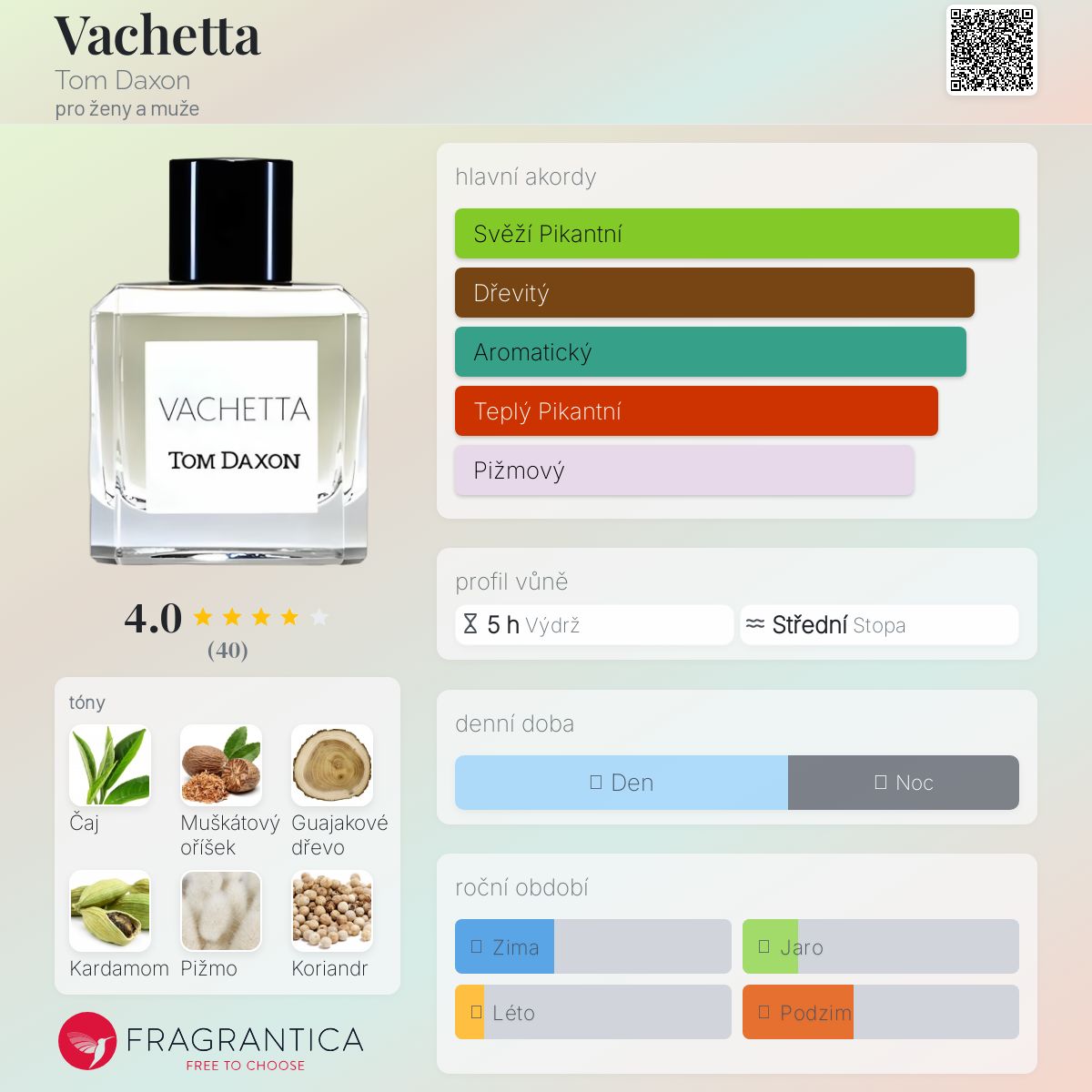 Vachetta podle Tom Daxon je Leather vůně pro ženy a muže. Vachetta byl/a uveden/a v roce 2013. Vrchní tóny jsou Muškátový oříšek, Kardamom a Koriandr; střední tóny jsouČaj, Guajakové dřevo a Jasmín ; základní tóny jsou Pižmo a Kůže.