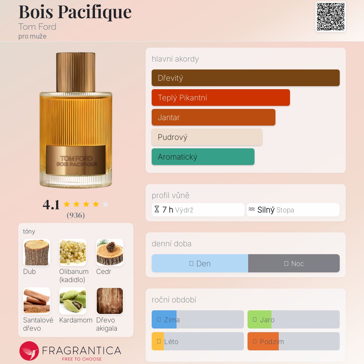 Bois Pacifique podle Tom Ford je Woody Aromatic vůně pro muže. Toto je nová vůně. Bois Pacifique byl/a uveden/a v roce 2024. Vrchní tóny jsou Kardamom, Dřevo akigala a Kurkuma; střední tóny jsouDub, Kadidlo, Cedr, Bílé santalové dřevo a Kosatec ; základní tóny jsou Jantar (ambra) a Vanilka.