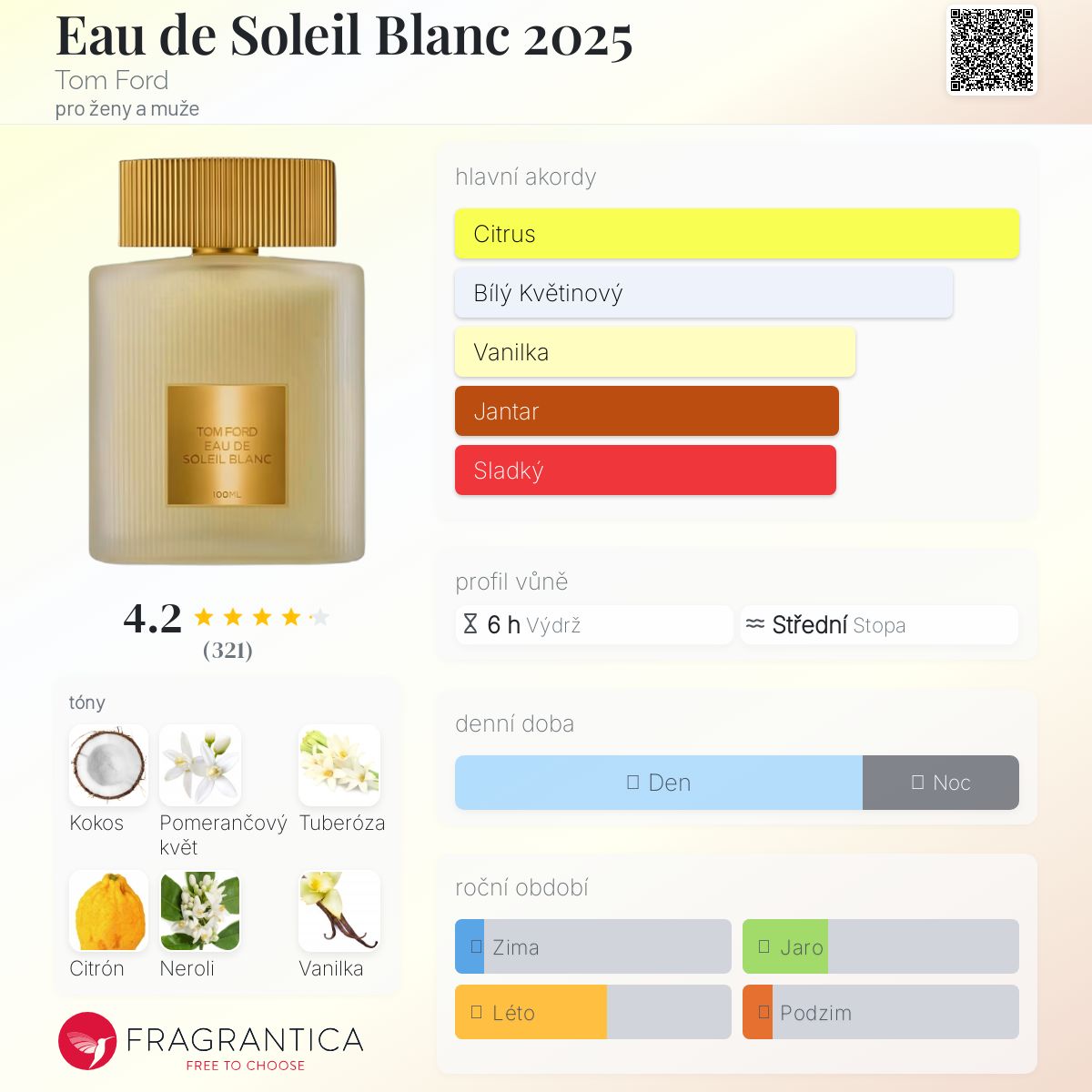 Eau de Soleil Blanc 2025 podle Tom Ford je Floral Fruity vůně pro ženy a muže. Toto je nová vůně. Eau de Soleil Blanc 2025 byl/a uveden/a v roce 2025. Vrchní tóny jsou Citrón, Neroli, Hořký pomeranč, Bergamot, Petitgrain, Pistácie, Kardamom, Růžový pepř a Kmín; střední tóny jsouTuniský pomerančový květ, Tuberóza, Ylang-Ylang, Jasmín a Galbanum ; základní tóny jsou Kokos, Vanilka, Benzoin, Jantar (ambra) a Fazole tonka.
