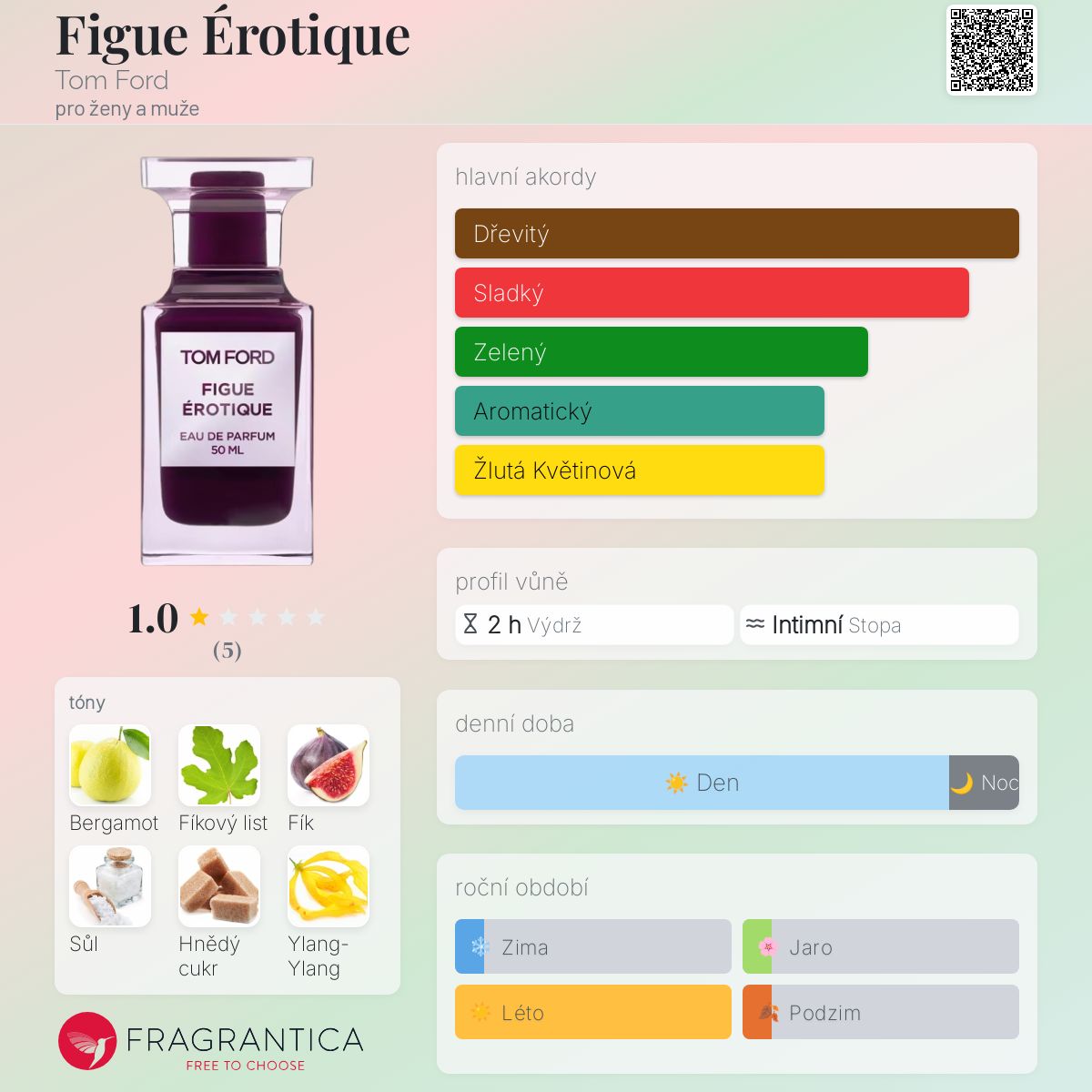 Figue Érotique podle Tom Ford je Floral Fruity Gourmand vůně pro ženy a muže. Toto je nová vůně. Figue Érotique byl/a uveden/a v roce 2025. Vrchní tóny jsou Fíkový list, Bergamot, Růžový pepř a Mandarinka; střední tóny jsouFík, Ylang-Ylang a Sůl ; základní tóny jsou Lékořice, Hnědý cukr, Vetiver a Pačuli.