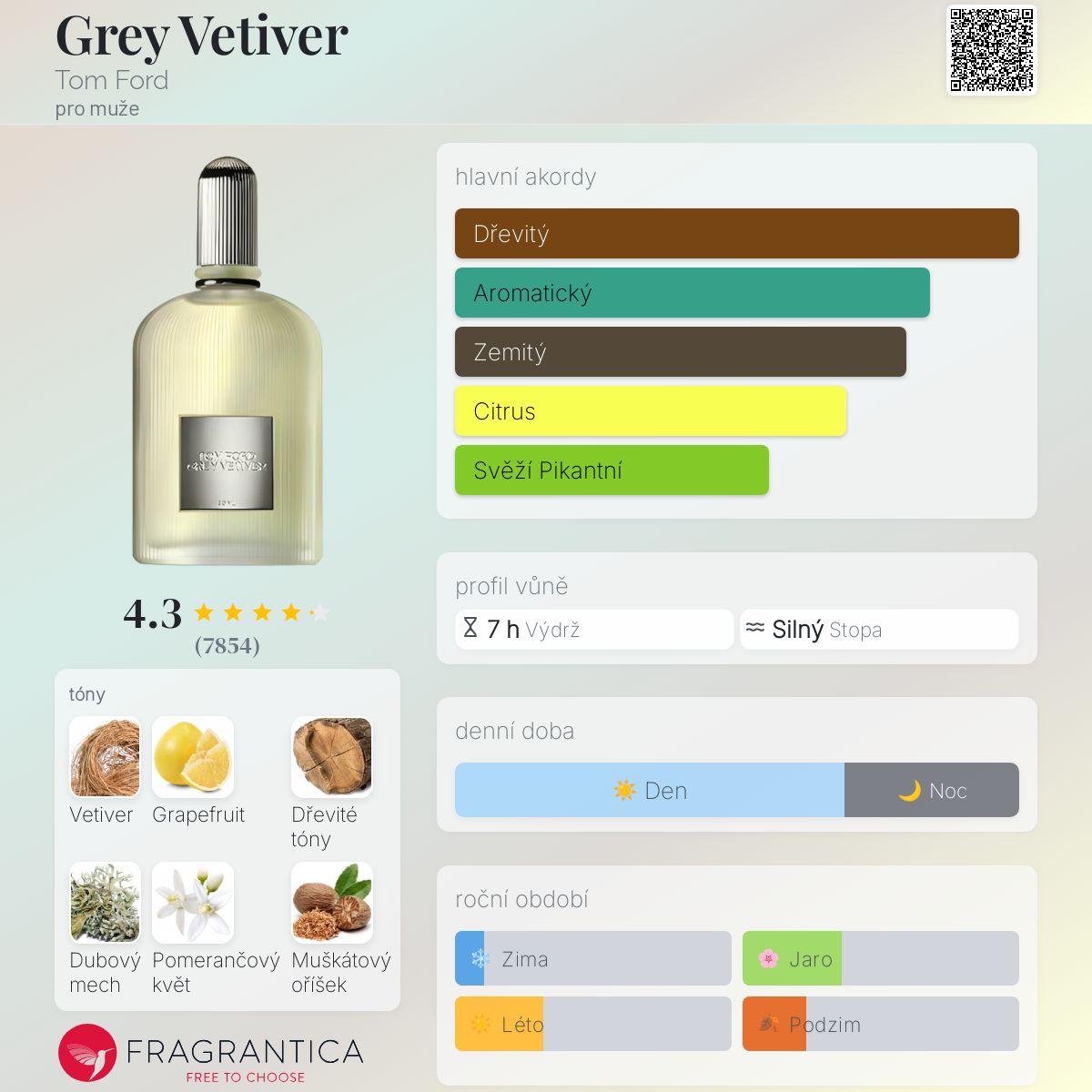 Grey Vetiver podle Tom Ford je Woody Spicy vůně pro muže. Grey Vetiver byl/a uveden/a v roce 2009. "Nosem" za touto vůní je Harry Fremont. Vrchní tóny jsou Grapefruit, Pomerančový květ a Šalvěj; střední tóny jsouMuškátový oříšek, Kořen orris a Jamajský pepř ; základní tóny jsou Vetiver, Dřevité tóny, Dubový mech a Jantar (ambra).