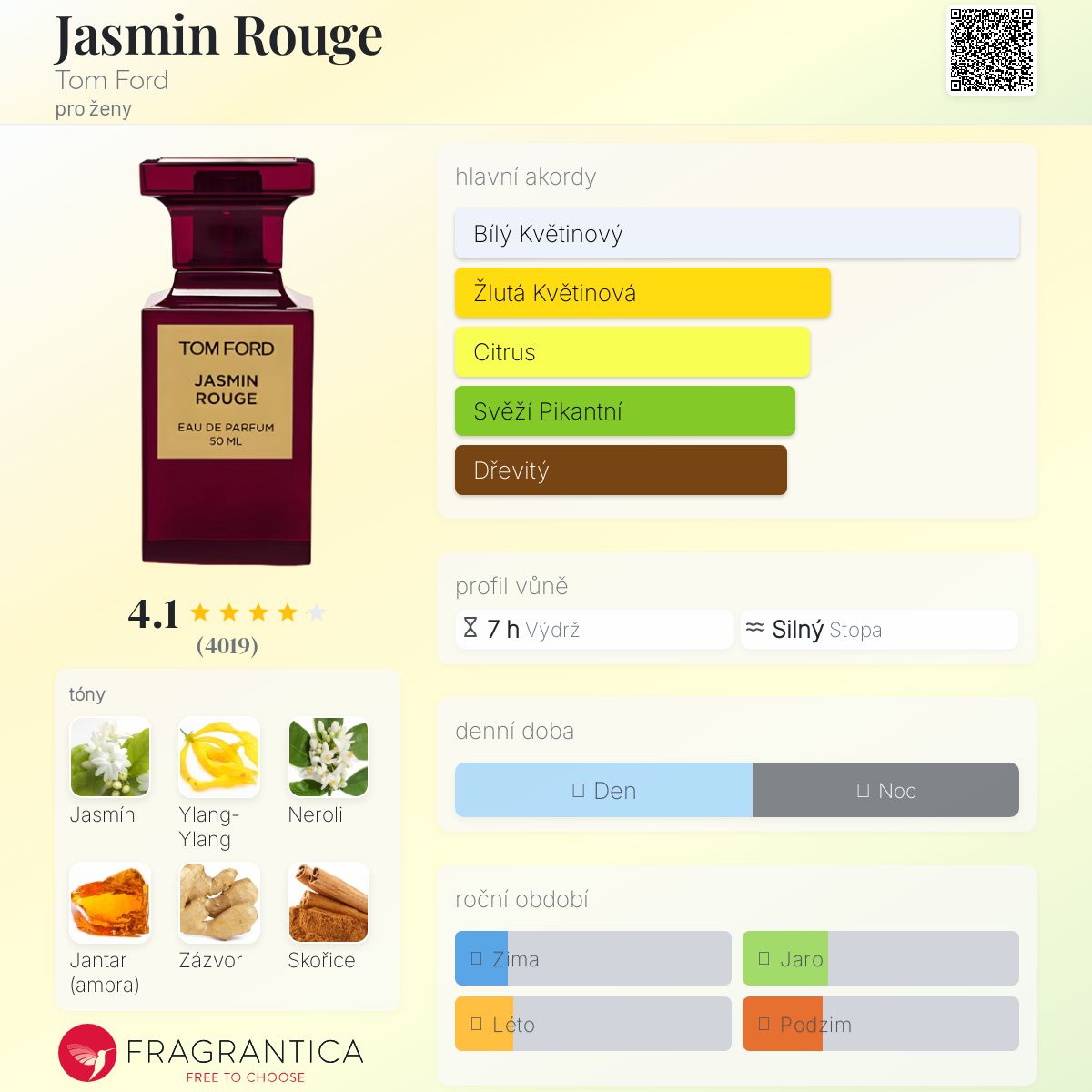 Jasmin Rouge podle Tom Ford je Orientální Floral vůně pro ženy. Jasmin Rouge byl/a uveden/a v roce 2011. "Nosem" za touto vůní je Rodrigo Flores-Roux. Vrchní tóny jsou Zázvor, Skořice, Bergamot, Kardamom, Pepř a Mandarinka; střední tóny jsouJasmín, Ylang-Ylang, Neroli, Janovec a Šalvěj muškátová ; základní tóny jsou Jantar (ambra), Vanilka, Dřevité tóny, Kůže a Francouzské labdanum.