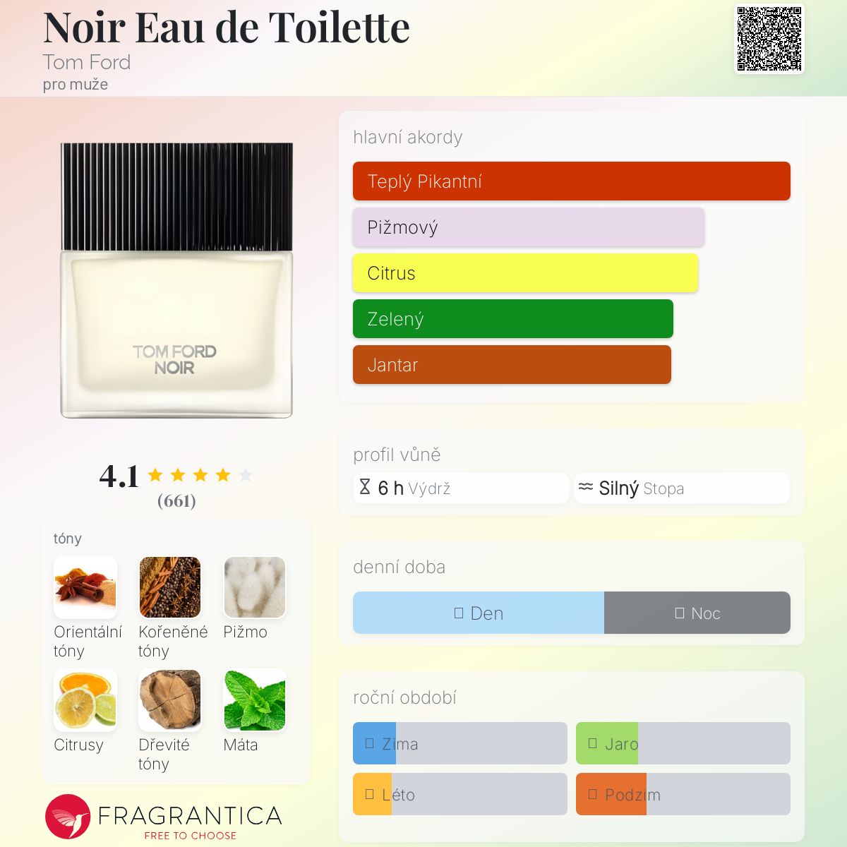 Noir Eau de Toilette podle Tom Ford je Aromatic Spicy vůně pro muže. Noir Eau de Toilette byl/a uveden/a v roce 2013. Vrchní tóny jsou Citrusy, Máta a Italský citrón; střední tóny jsouOrientální tóny, Koření a Bylinné tóny ; základní tóny jsou Pižmo a Dřevité tóny.