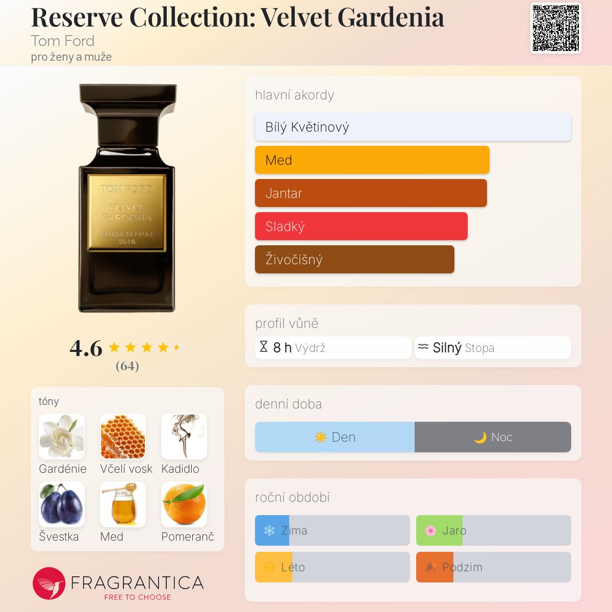 Reserve Collection: Velvet Gardenia podle Tom Ford je Orientální Floral vůně pro ženy a muže. Reserve Collection: Velvet Gardenia byl/a uveden/a v roce 2019. Vrchní tóny jsou Gardénie a Pomeranč; střední tóny jsouVčelí vosk, Švestka, Med, Tuberóza, Jasmín, Růže a Konvalinka ; základní tóny jsou Kadidlo a Labdanum.