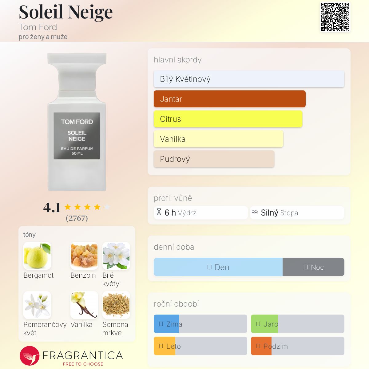 Soleil Neige podle Tom Ford je Orientální Floral vůně pro ženy a muže. Soleil Neige byl/a uveden/a v roce 2019. "Nosem" za touto vůní je Givaudan. Vrchní tóny jsou Bergamot a Semena mrkve; střední tóny jsouBílé květy, Pomerančový květ, Jasmín, Růže a Turecká růže ; základní tóny jsou Benzoin, Vanilka a Labdanum.