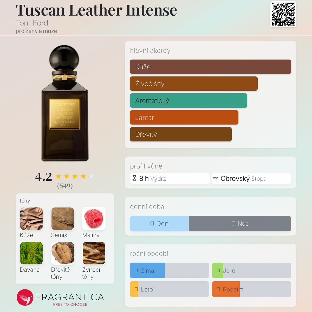 Tuscan Leather Intense podle Tom Ford je Leather vůně pro ženy a muže. Tuscan Leather Intense byl/a uveden/a v roce 2019. Vrchní tóny jsou Maliny, Davana, Šafrán a Tymián; střední tóny jsouDřevité tóny, Olibanum a Jasmín ; základní tóny jsou Kůže, Semiš, Dřevité tóny, Zvířecí tóny a Jantar (ambra).