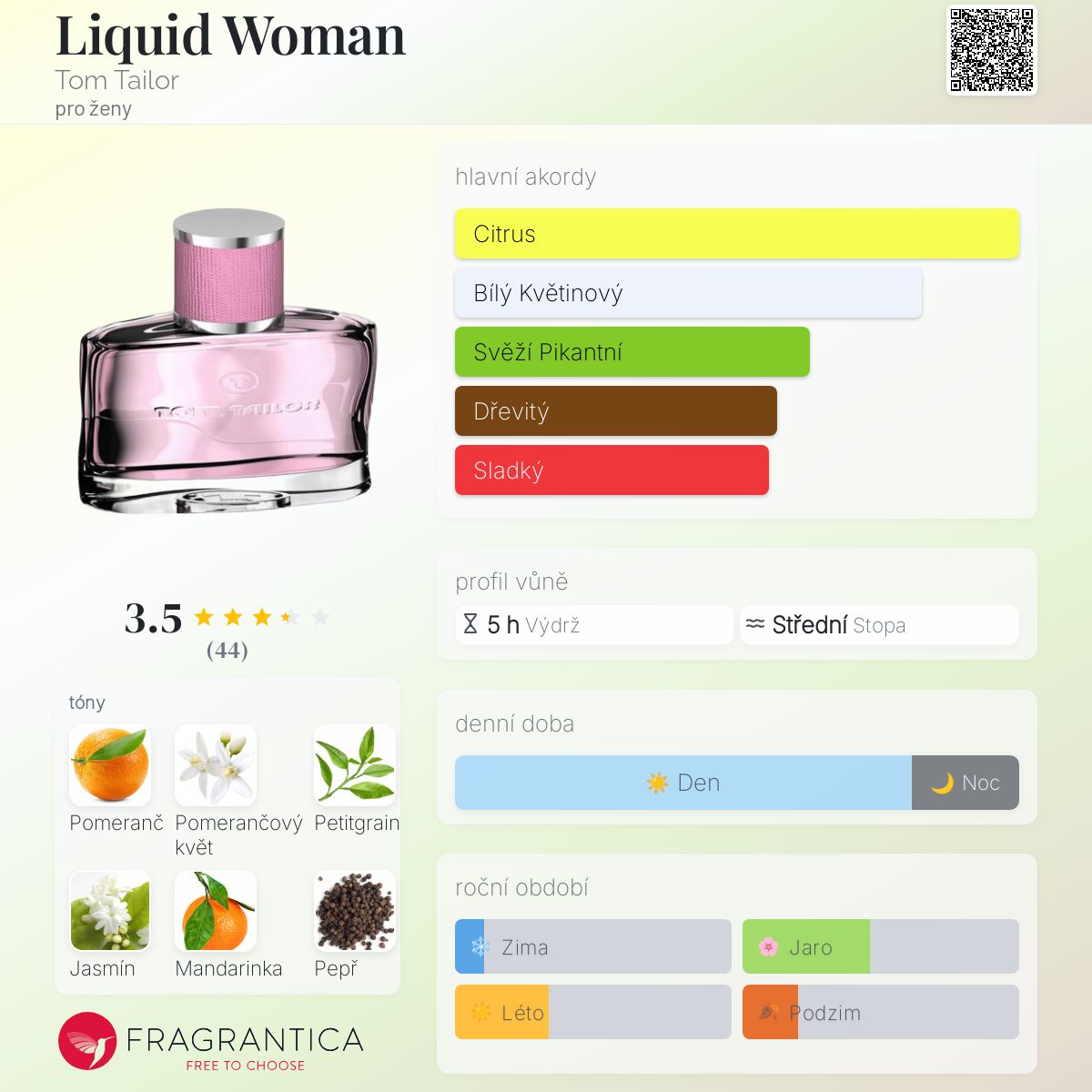Liquid Woman podle Tom Tailor je Orientální Floral vůně pro ženy. Liquid Woman byl/a uveden/a v roce 2010. "Nosem" za touto vůní je Christian Plesch. Vrchní tóny jsou Pomeranč, Petitgrain, Mandarinka a Pepř; střední tóny jsouKvět afrického pomeranče, Jasmín a Růže ; základní tóny jsou Santalové dřevo a Jantar (ambra).