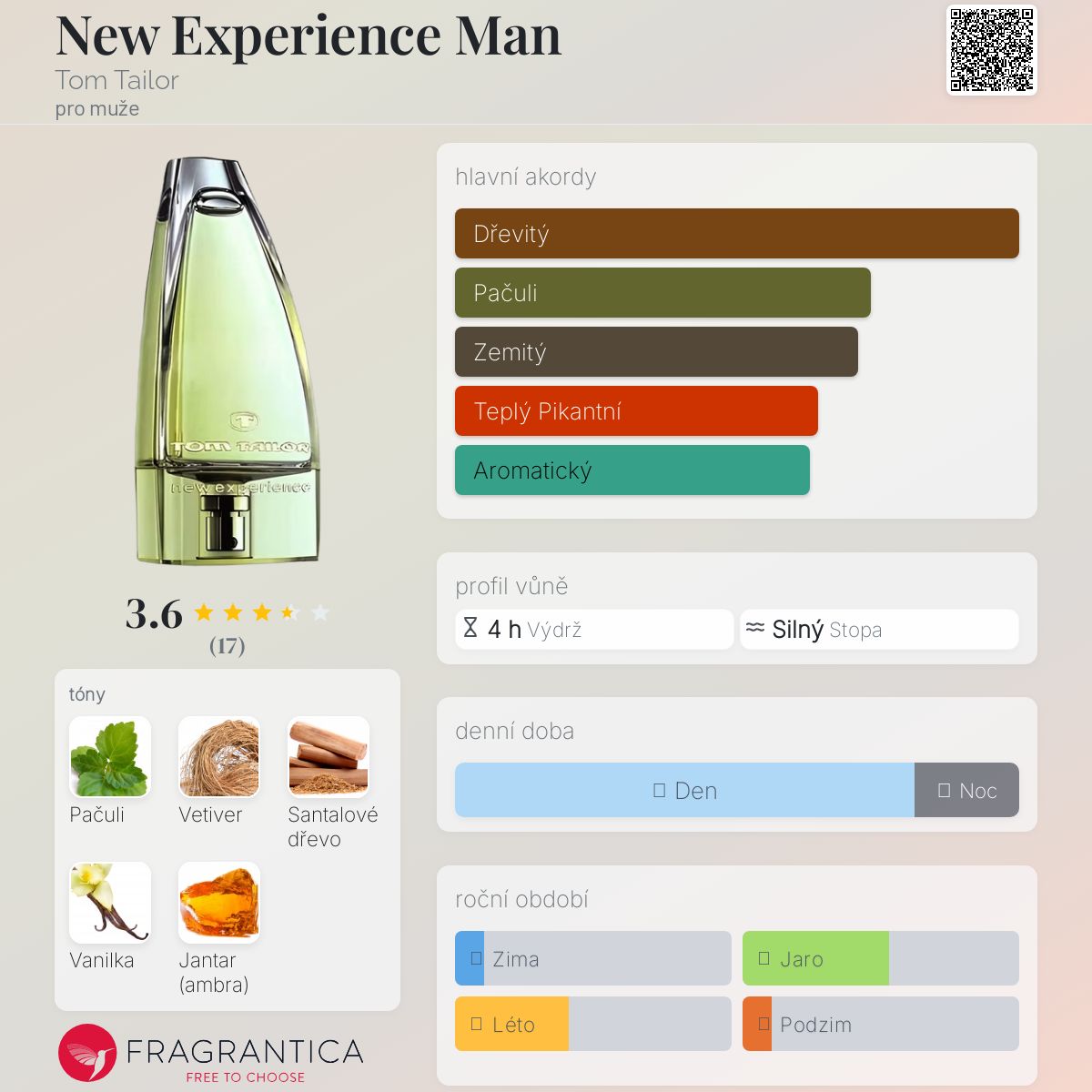 New Experience Man podle Tom Tailor je Aromatic Fougere vůně pro muže. New Experience Man byl/a uveden/a v roce 2006. "Nosem" za touto vůní je Christian Plesch. základní tóny jsou Pačuli, Vetiver, Santalové dřevo, Vanilka a Jantar (ambra).