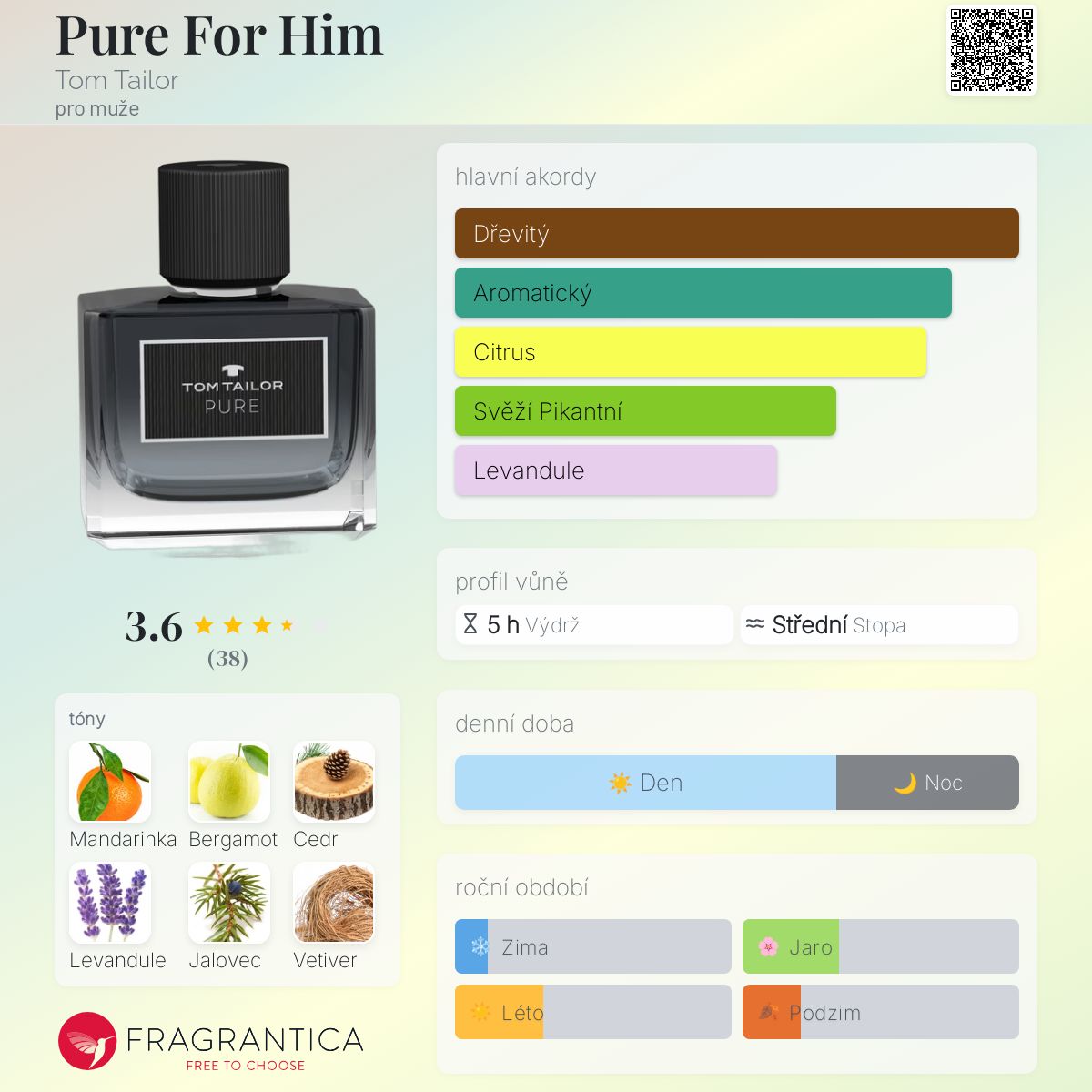 Pure For Him podle Tom Tailor je Woody Aromatic vůně pro muže. Pure For Him byl/a uveden/a v roce 2021. Vrchní tóny jsou Mandarinka, Bergamot a Jalovec; střední tóny jsouCedr, Levandule, Borovice a Skořice ; základní tóny jsou Vetiver, Pižmo, Santalové dřevo, Mech a Vanilka.