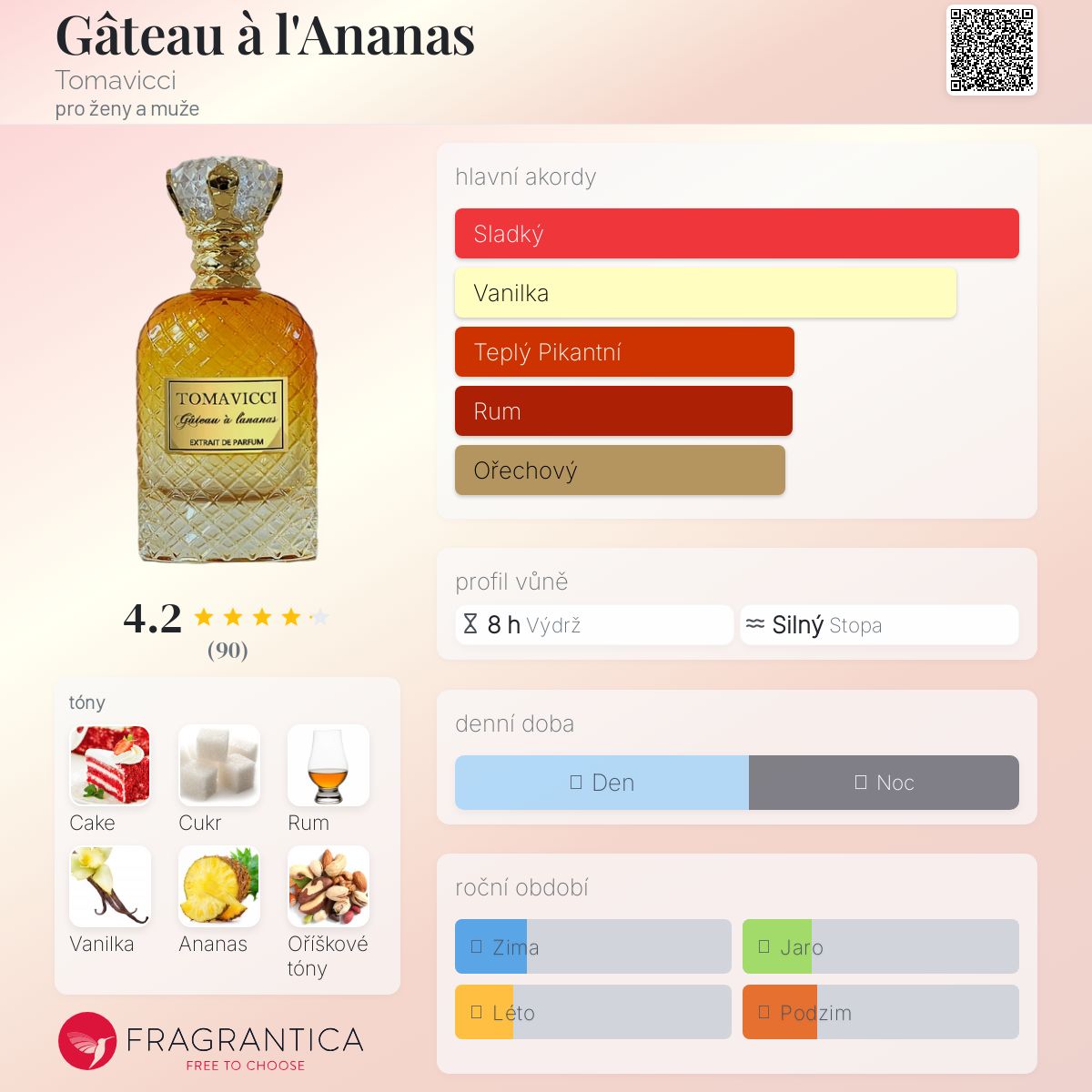 Gâteau à l'Ananas podle Tomavicci je Orientální Vanilla vůně pro ženy a muže. Toto je nová vůně. Gâteau à l'Ananas byl/a uveden/a v roce 2025. "Nosem" za touto vůní je Chris Maurice. Vrchní tóny jsou Dort, Rum a Ananas; střední tóny jsouCukr, Oříškové tóny, Kokos a Skořice ; základní tóny jsou Vanilka, Fazole tonka a Pižmo.
