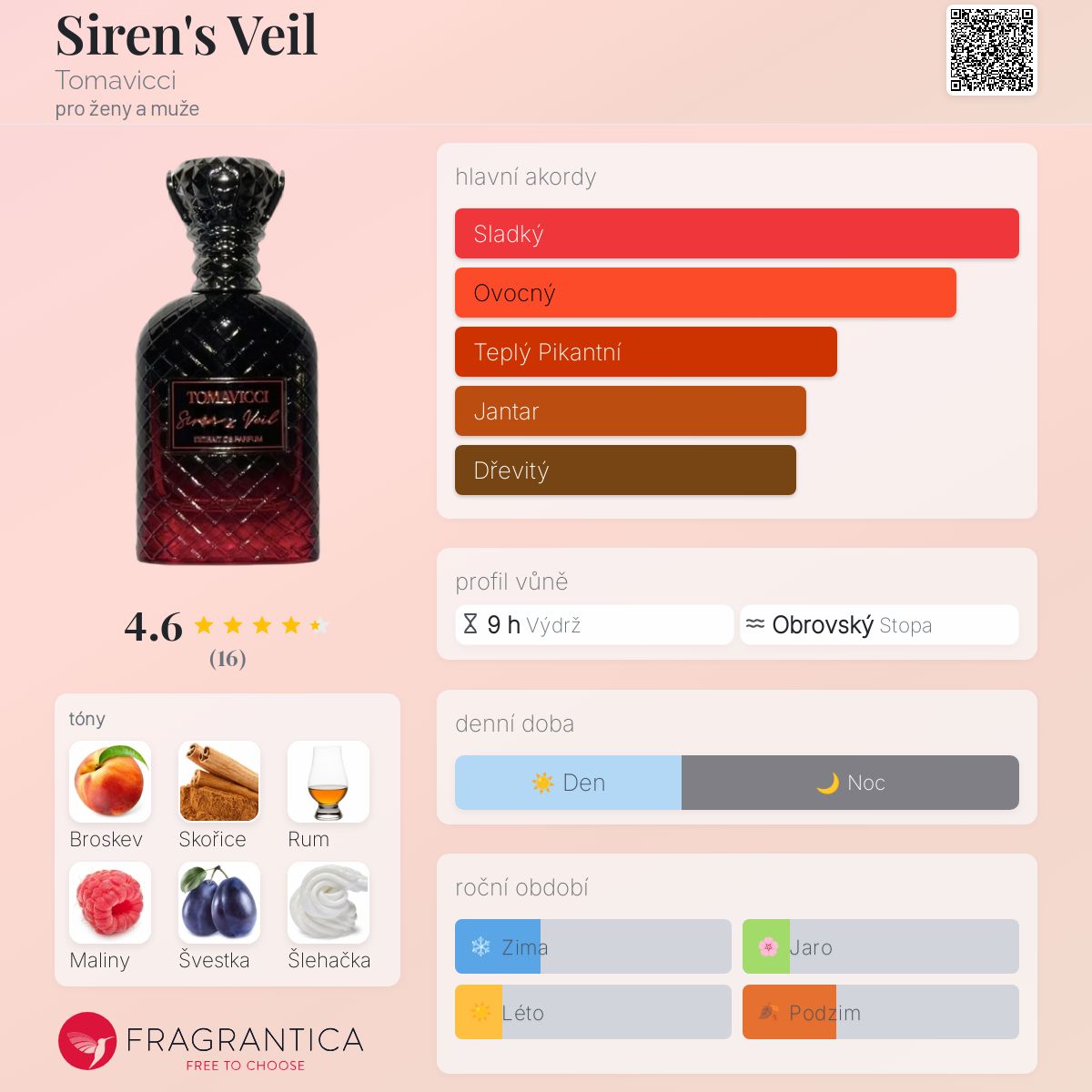 Siren's Veil podle Tomavicci je vůně pro ženy a muže. "Nosem" za touto vůní je Christian Provenzano. Vrchní tóny jsou Broskev, Skořice, Rum, Švestka, Bříza a Anýz; střední tóny jsouMaliny, Šlehačka, Cukr a Šalvěj ; základní tóny jsou Tabák, Benzoin, Jantar (ambra), Pačuli, Vetiver, Pižmo a Mech.