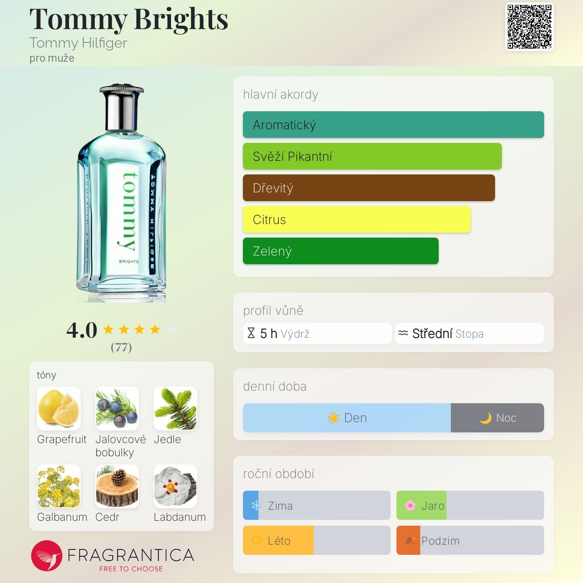 Tommy Brights podle Tommy Hilfiger je Woody Aromatic vůně pro muže. Tommy Brights byl/a uveden/a v roce 2014. Vrchní tóny jsou Grapefruit, Jalovcové bobulky a Galbanum; střední tóny jsouJedle balzámová, Cedr a Labdanum ; základní tóny jsou Bílý jantar (ambra) a Pižmo.