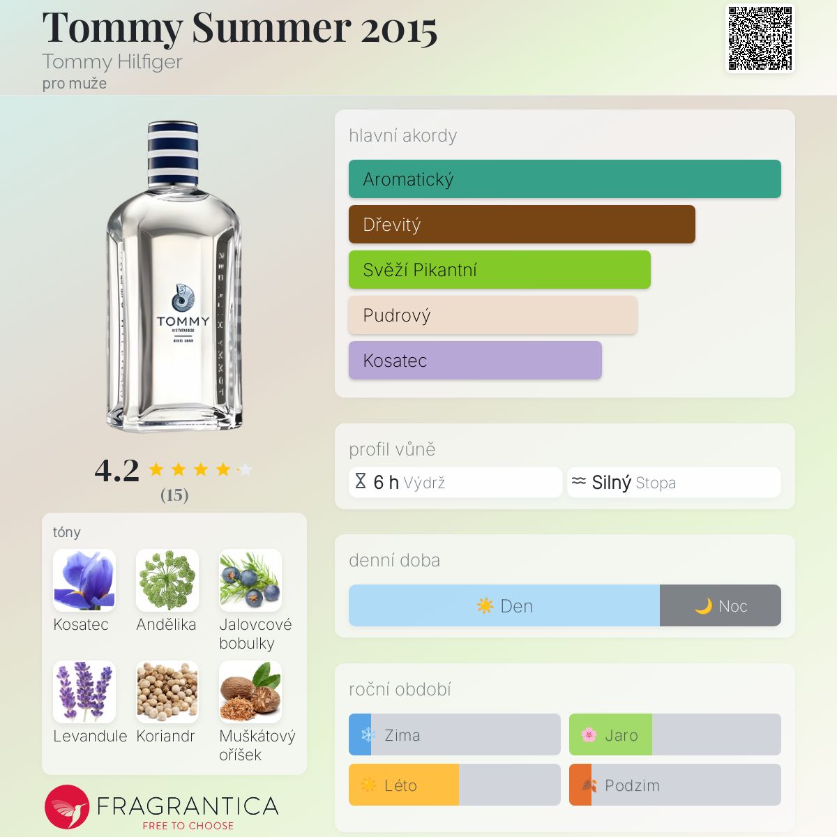 Tommy Summer 2015 podle Tommy Hilfiger je Aromatic vůně pro muže. Tommy Summer 2015 byl/a uveden/a v roce 2015. Vrchní tóny jsou Andělika, Jalovcové bobulky, Levandule, Cypřiš a Šalvěj muškátová; střední tóny jsouKoriandr, Muškátový oříšek a Kardamom ; základní tóny jsou Kosatec, Vetiver, Fazole tonka, Cedr a Santalové dřevo.