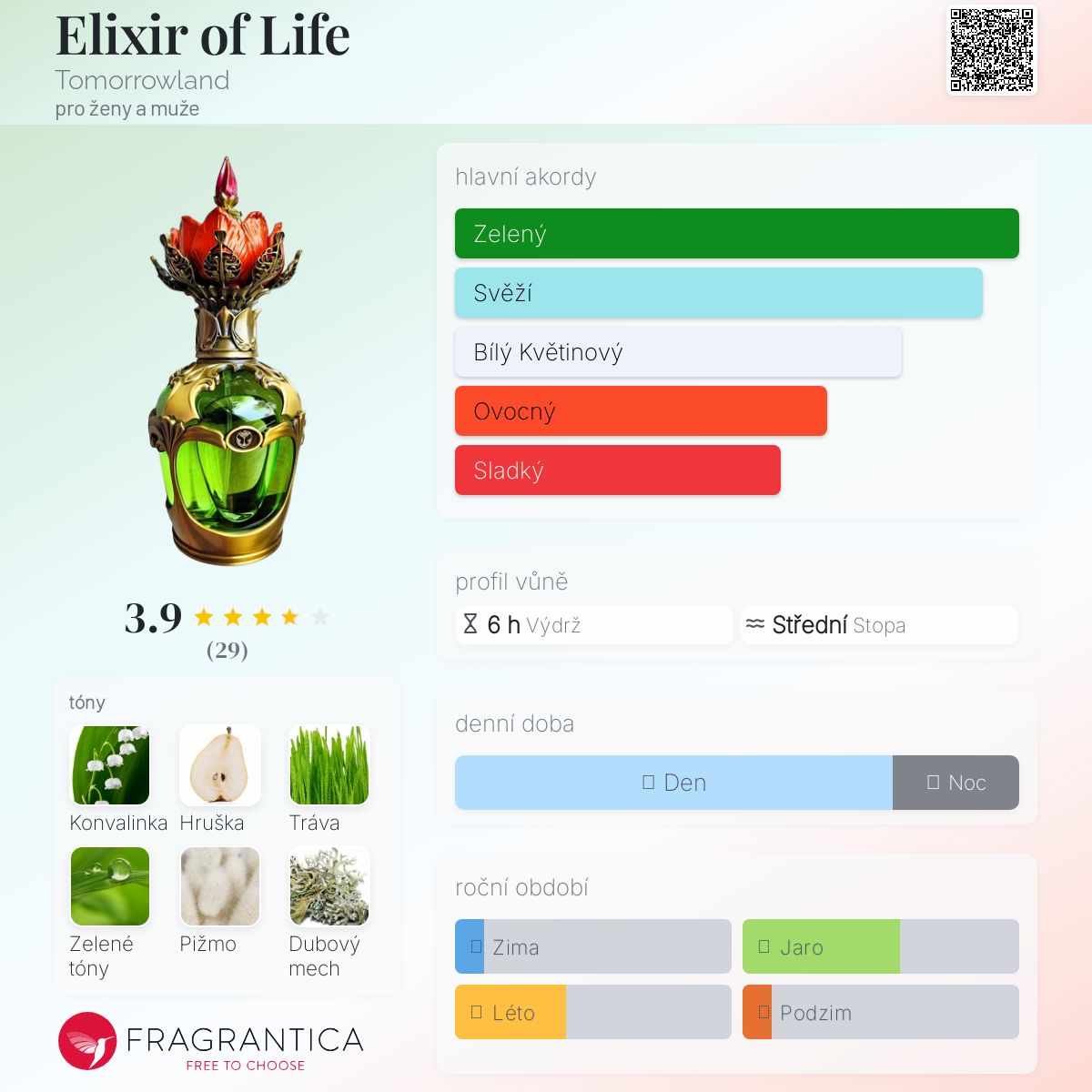 Elixir of Life podle Tomorrowland je Aromatic Fruity vůně pro ženy a muže. Toto je nová vůně. Elixir of Life byl/a uveden/a v roce 2024. Vrchní tóny jsou Hruška, Tráva a Černý rybíz; střední tóny jsouKonvalinka, Zelené listí a Gardénie ; základní tóny jsou Pižmo a Mech.