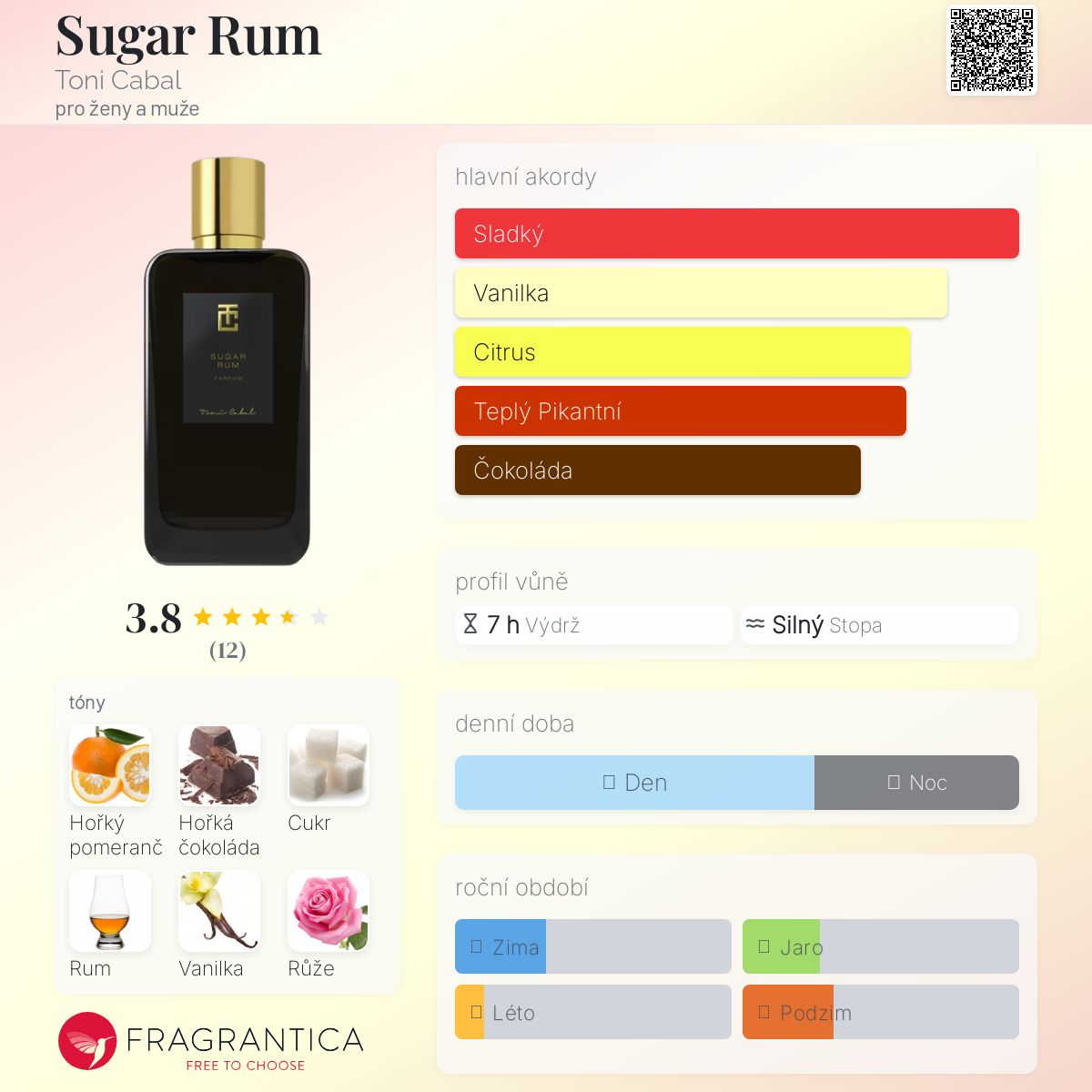 Sugar Rum podle Toni Cabal je Citrus Gourmand vůně pro ženy a muže. Sugar Rum byl/a uveden/a v roce 2019. "Nosem" za touto vůní je Toni Cabal. Vrchní tóny jsou Hořký pomeranč a Rum; střední tóny jsouBulharská růže a Káva ; základní tóny jsou Hořká čokoláda, Cukr, Vanilka, Benzoin a Cedr.