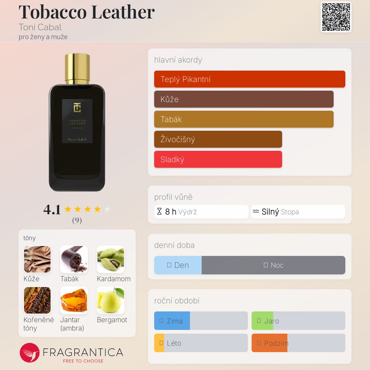 Tobacco Leather podle Toni Cabal je Orientální Woody vůně pro ženy a muže. Tobacco Leather byl/a uveden/a v roce 2021. "Nosem" za touto vůní je Toni Cabal. Vrchní tón je Bergamot ; střední tóny jsouKardamom, Koření a Pivoňka ; základní tóny jsou Kůže, Tabák a Jantar (ambra).