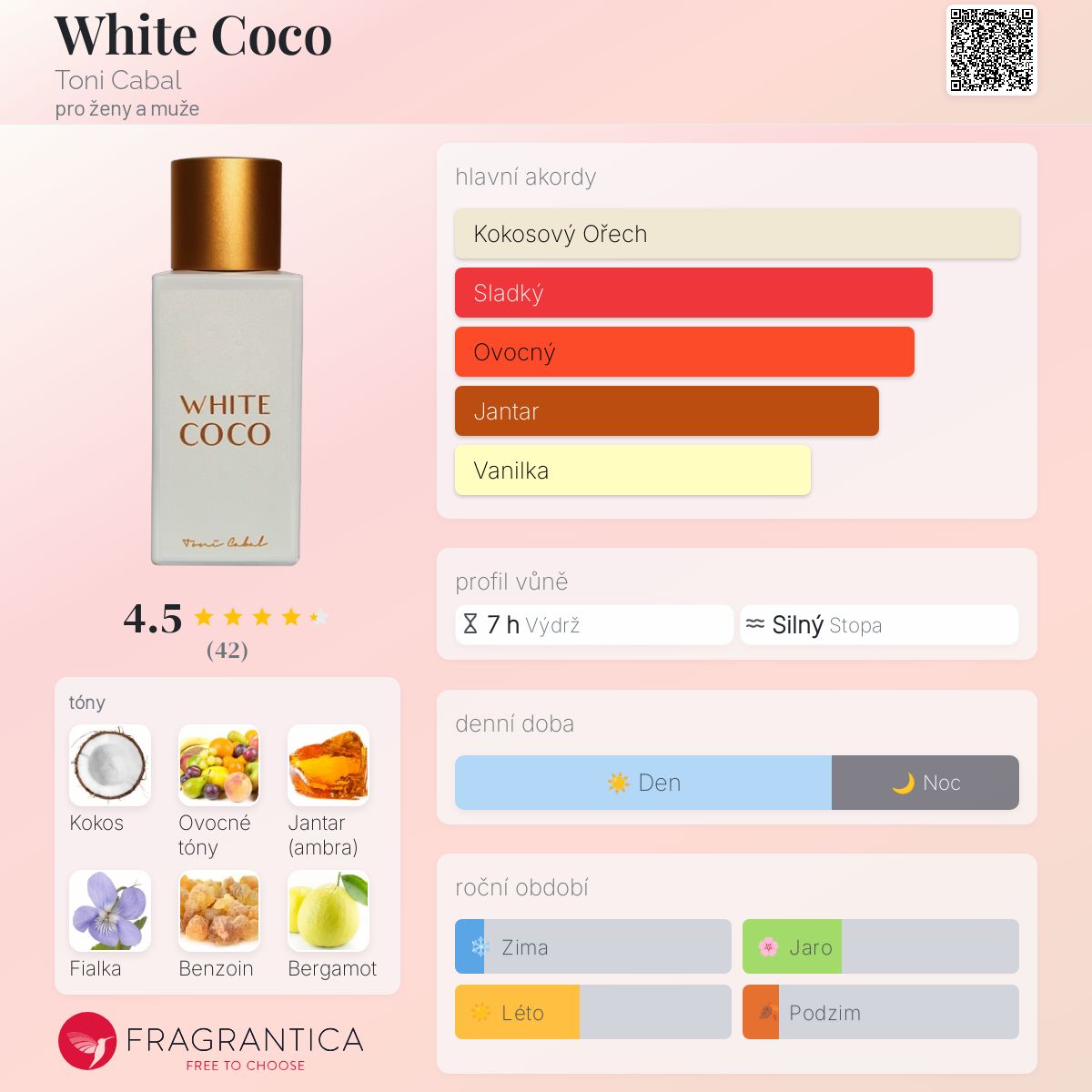 White Coco podle Toni Cabal je Citrus Gourmand vůně pro ženy a muže. White Coco byl/a uveden/a v roce 2021. "Nosem" za touto vůní je Toni Cabal. Vrchní tóny jsou Ovocné tóny a Bergamot; střední tóny jsouFialka a Konvalinka ; základní tóny jsou Kokosové mléko, Jantar (ambra) a Siamský (thajský) benzoin.