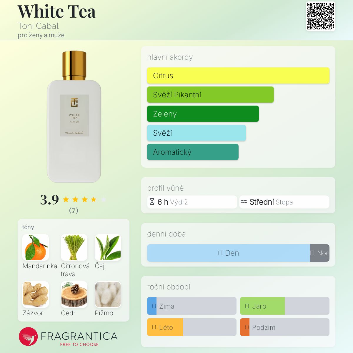 White Tea podle Toni Cabal je Floral Woody Musk vůně pro ženy a muže. White Tea byl/a uveden/a v roce 2021. "Nosem" za touto vůní je Toni Cabal. Vrchní tóny jsou Citronová tráva a Mandarinka; střední tóny jsouZelený čaj a Zázvor ; základní tóny jsou Cedr a Bílé pižmo.