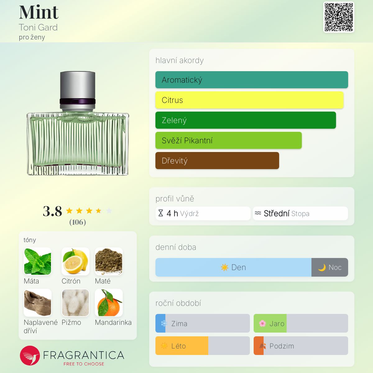 Mint podle Toni Gard je Floral Green vůně pro ženy. Mint byl/a uveden/a v roce 2012. Vrchní tóny jsou Máta peprná, Citrón, Maté, Mandarinka a Pomeranč; střední tóny jsouMučenka, Kosatec a Konvalinka ; základní tóny jsou Naplavené dříví, Pižmo, Bílá broskev a Jantar (ambra).