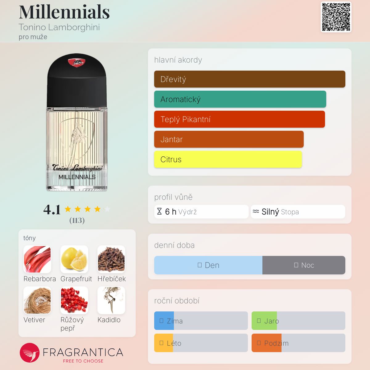 Millennials podle Tonino Lamborghini je Woody Spicy vůně pro muže. Millennials byl/a uveden/a v roce 2021. Vrchní tóny jsou Rebarbora, Grapefruit, Růžový pepř a Kadidlo; střední tóny jsouHřebíček, Jantar (ambra), Fialka a Kůže ; základní tóny jsou Vetiver, Cedr, Pačuli a Kašmírové dřevo.