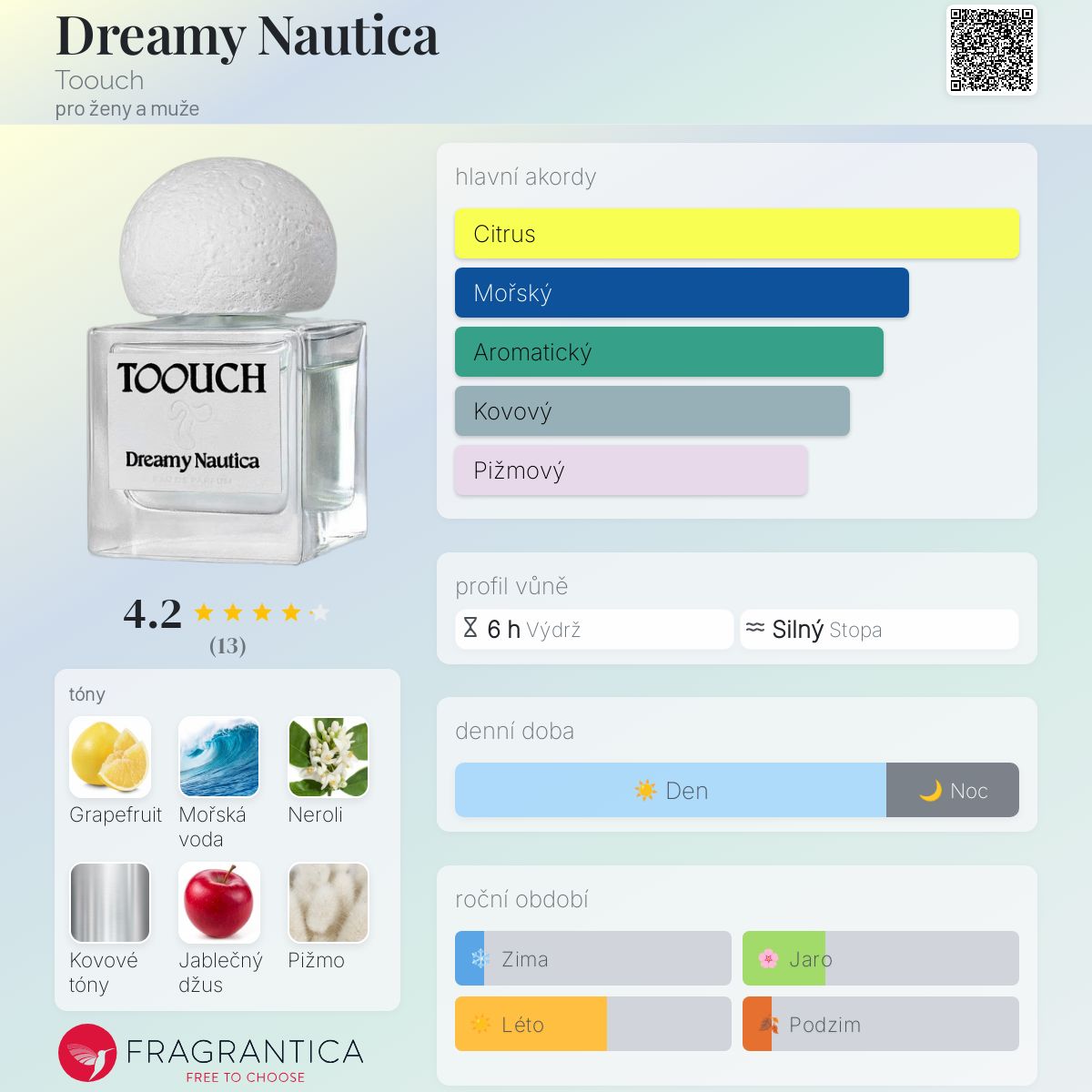 Dreamy Nautica podle Toouch je Aromatic Aquatic vůně pro ženy a muže. Toto je nová vůně. Dreamy Nautica byl/a uveden/a v roce 2025. "Nosem" za touto vůní je Sy Truong. Vrchní tóny jsou Grapefruit a Jablečný džus; střední tóny jsouNeroli a Mořská sůl ; základní tóny jsou Vodní tóny, Kovové tóny a Pižmo.