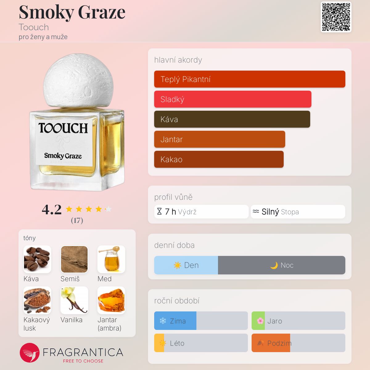 Smoky Graze podle Toouch je Orientální Floral vůně pro ženy a muže. Toto je nová vůně. Smoky Graze byl/a uveden/a v roce 2025. "Nosem" za touto vůní je Sy Truong. Vrchní tóny jsou Káva a Skořice; střední tóny jsouMed, Kakao, Mandle a Turecká růže ; základní tóny jsou Semiš, Vanilka, Jantar (ambra) a Pralinka.