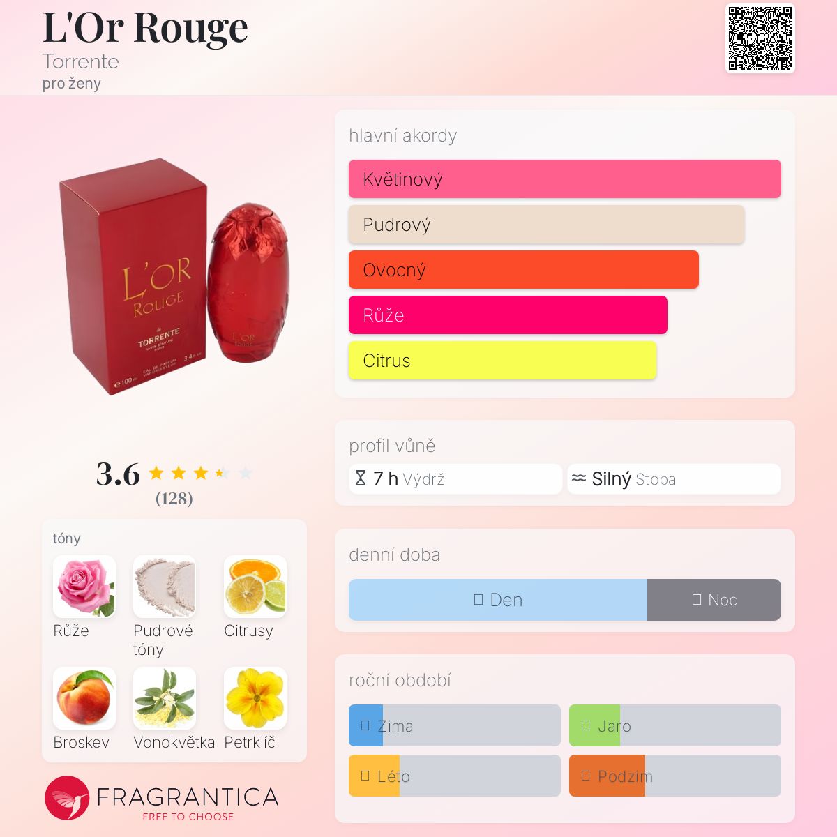 L'Or Rouge podle Torrente je vůně pro ženy. L'Or Rouge byl/a uveden/a v roce 2005. Vrchní tón je Citrusy ; střední tóny jsouČervená růže, Broskev, Vonokvětka, Petrklíč a Jasmín ; základní tóny jsou Pudrové tóny, Bílé pižmo, Pačuli a Jantar (ambra).