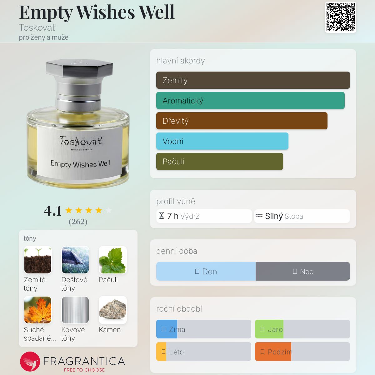 Empty Wishes Well podle Toskovat' je vůně pro ženy a muže. Empty Wishes Well byl/a uveden/a v roce 2022. "Nosem" za touto vůní je David-Lev Jipa-Slivinschi. Vrchní tón je Kovové tóny ; střední tóny jsouDešťové tóny, Suché spadané listí, Kámen, Šalvěj a Myrha ; základní tóny jsou Zemité tóny, Pačuli, Java vetiverový olej, Haitský vetiver, Galbanum, Amyris a Semena mrkve.