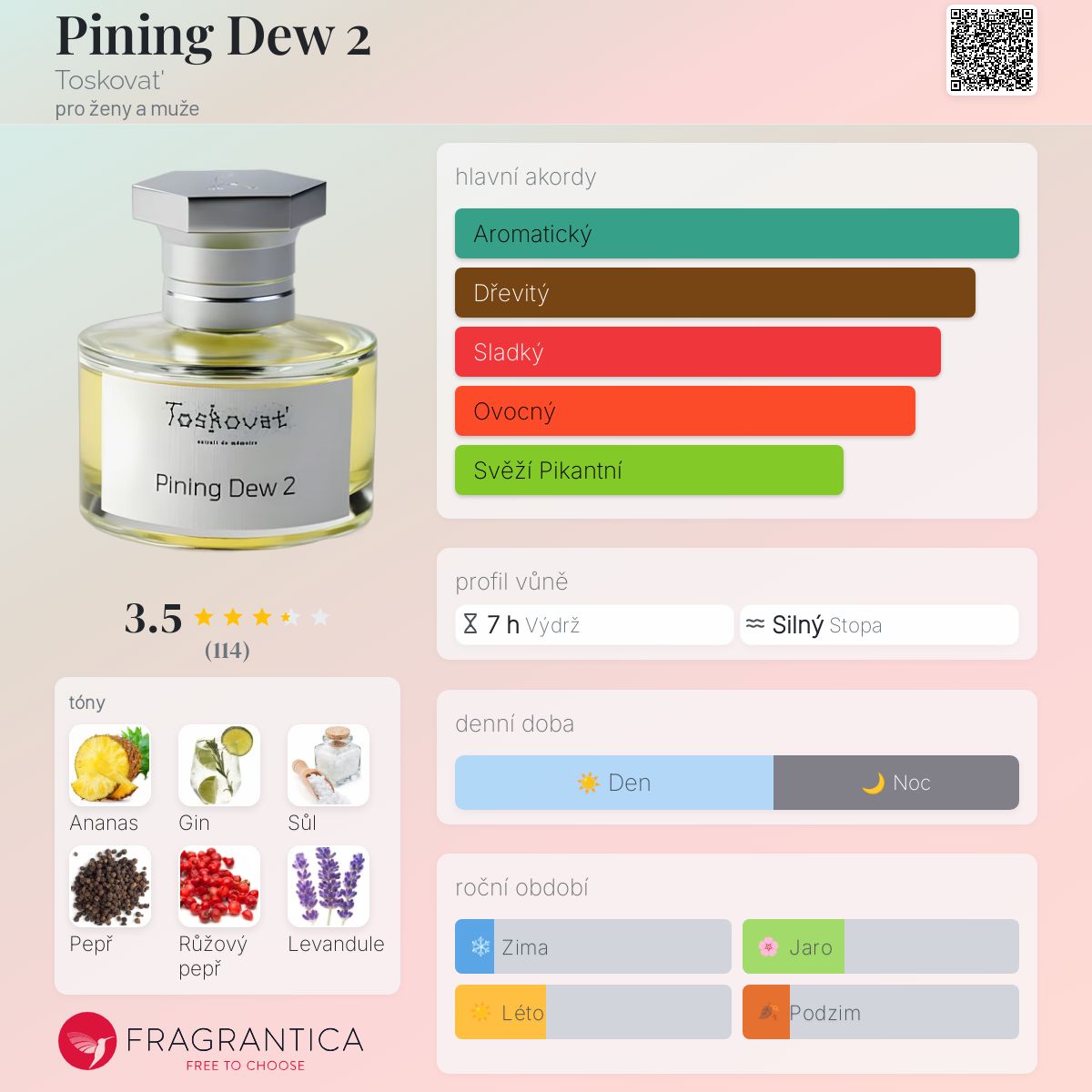 Pining Dew 2 podle Toskovat' je vůně pro ženy a muže. Pining Dew 2 byl/a uveden/a v roce 2022. "Nosem" za touto vůní je David-Lev Jipa-Slivinschi. Vrchní tóny jsou Ananas, Černý pepř, Růžový pepř a Levandule; střední tón jeGin ; základní tóny jsou Sůl, Java vetiverový olej, Cedr a Fazole tonka.