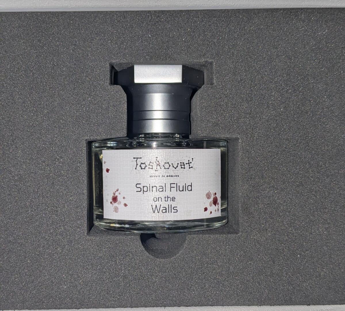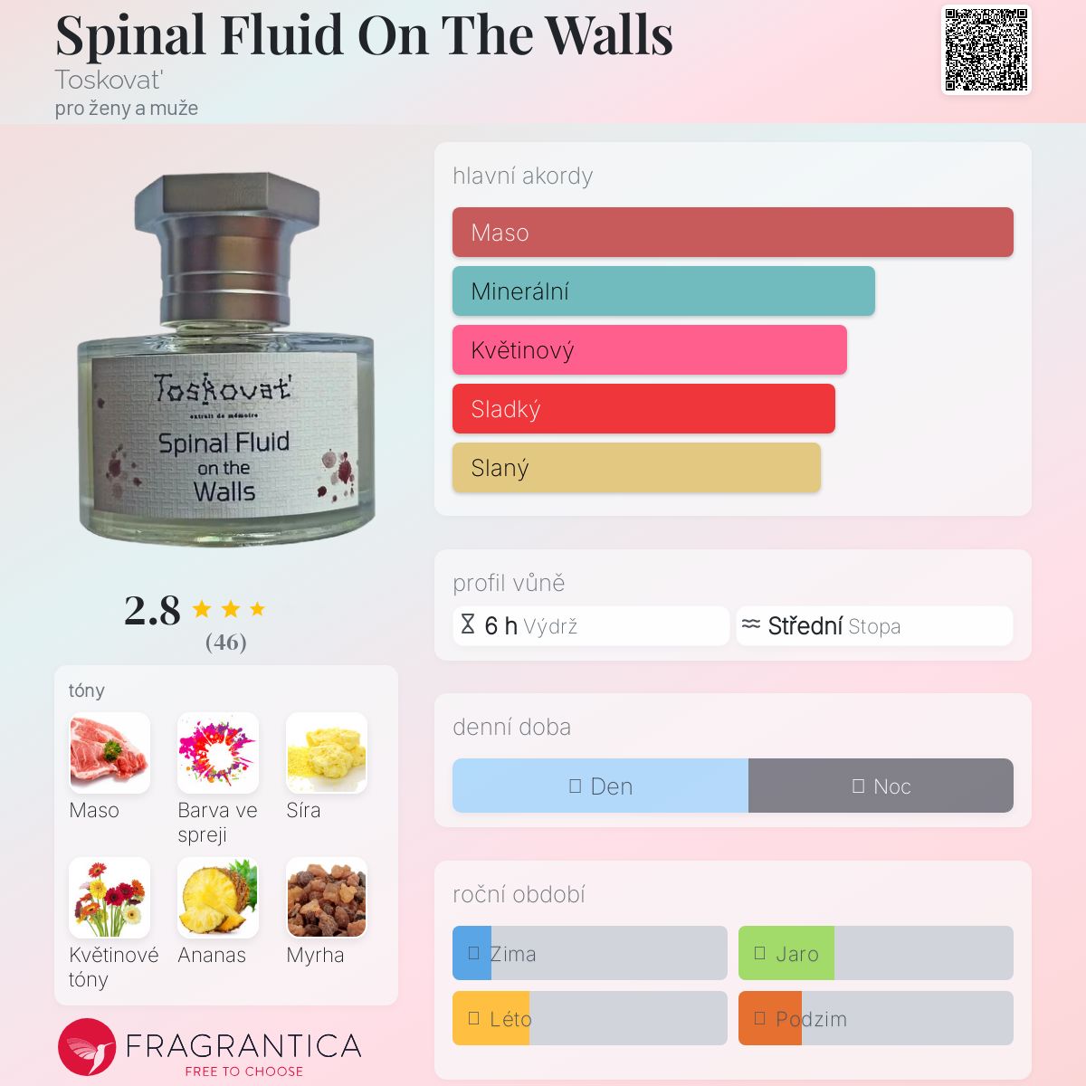 Spinal Fluid On The Walls podle Toskovat' je vůně pro ženy a muže. Toto je nová vůně. Spinal Fluid On The Walls byl/a uveden/a v roce 2025. "Nosem" za touto vůní je David-Lev Jipa-Slivinschi. Vrchní tóny jsou Barva ve spreji a Síra; střední tóny jsouKvětiny a Ananas ; základní tóny jsou Maso, Myrha, Guajakové dřevo a Vetiver.