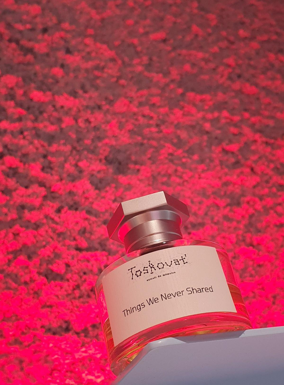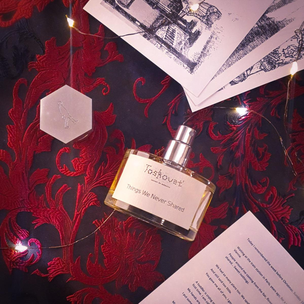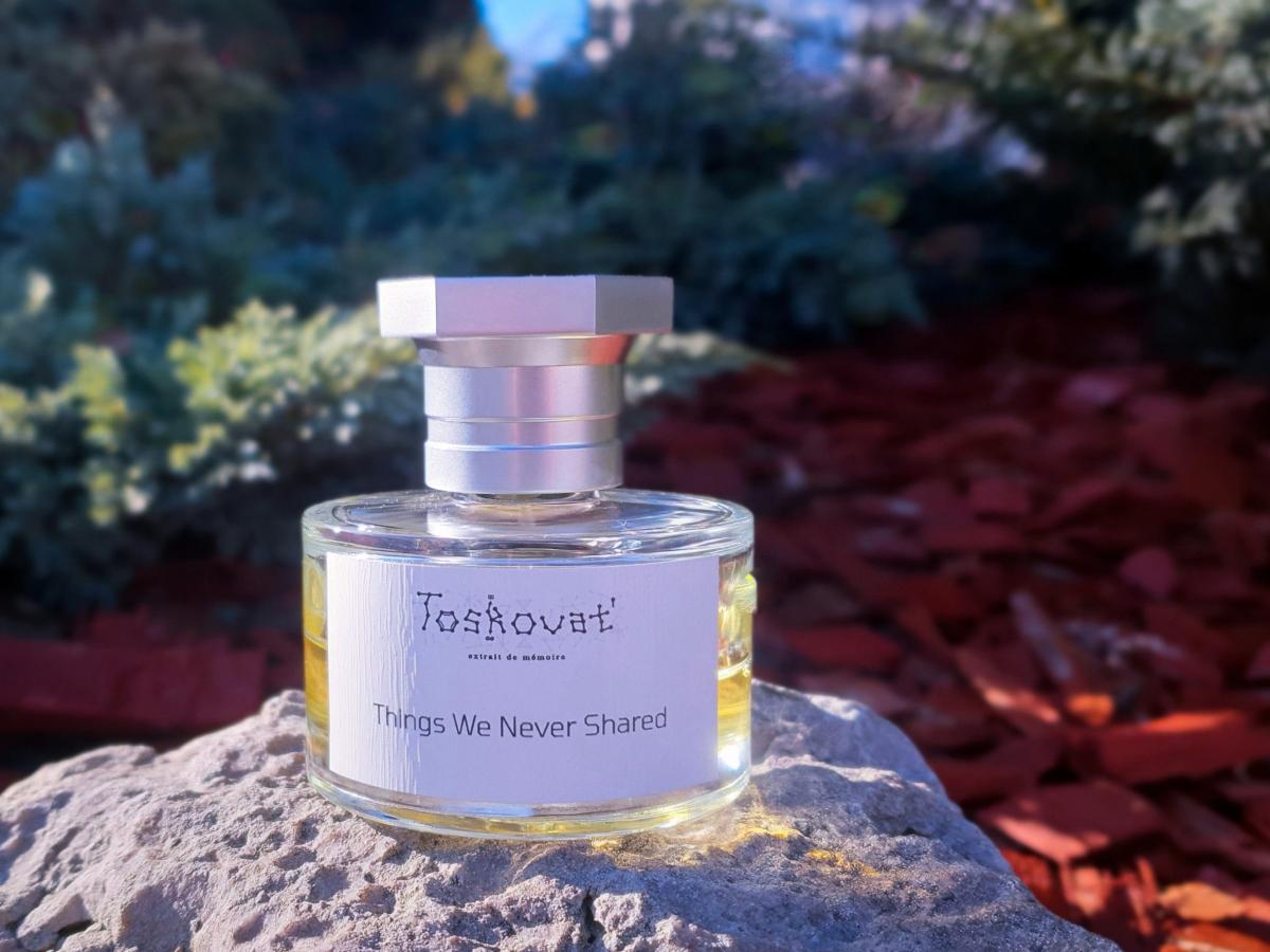 Things We Never Shared podle Toskovat' je Aromatic vůně pro ženy a muže. Things We Never Shared byl/a uveden/a v roce 2022. "Nosem" za touto vůní je David-Lev Jipa-Slivinschi. Vrchní tóny jsou Svařené víno, Advocaat, Mandarinka, Narcis a Hyacint; střední tóny jsouŠvestka, Panettone, Jed, Sacherův dort, Med, Makronky, Croissant, Kandované mandle, Černý rybíz a Pomeranč ; základní tóny jsou Kakao, Krém na ruce, Mléko, Karamela, Tabák, Jedle balzámová, Myrha, Santalové dřevo, Ebenové dřevo, Nard a Sněženky.