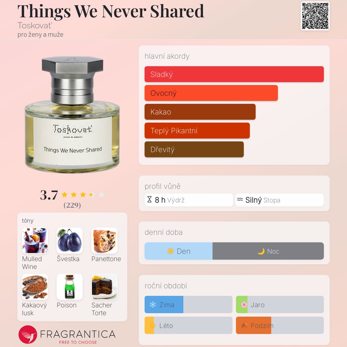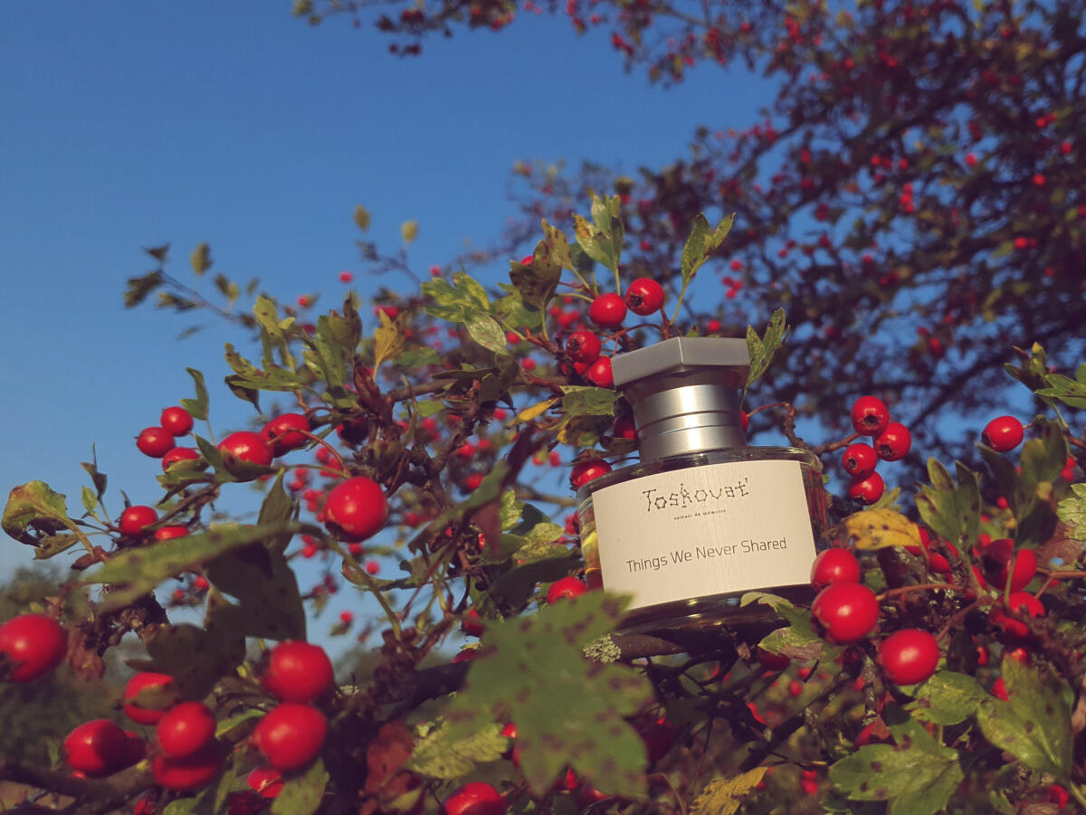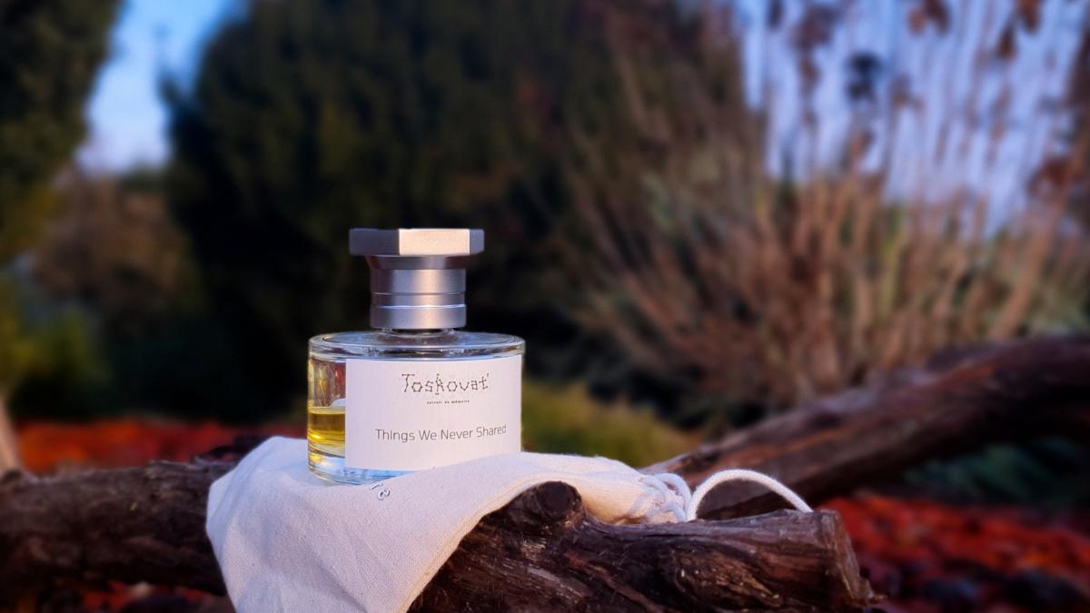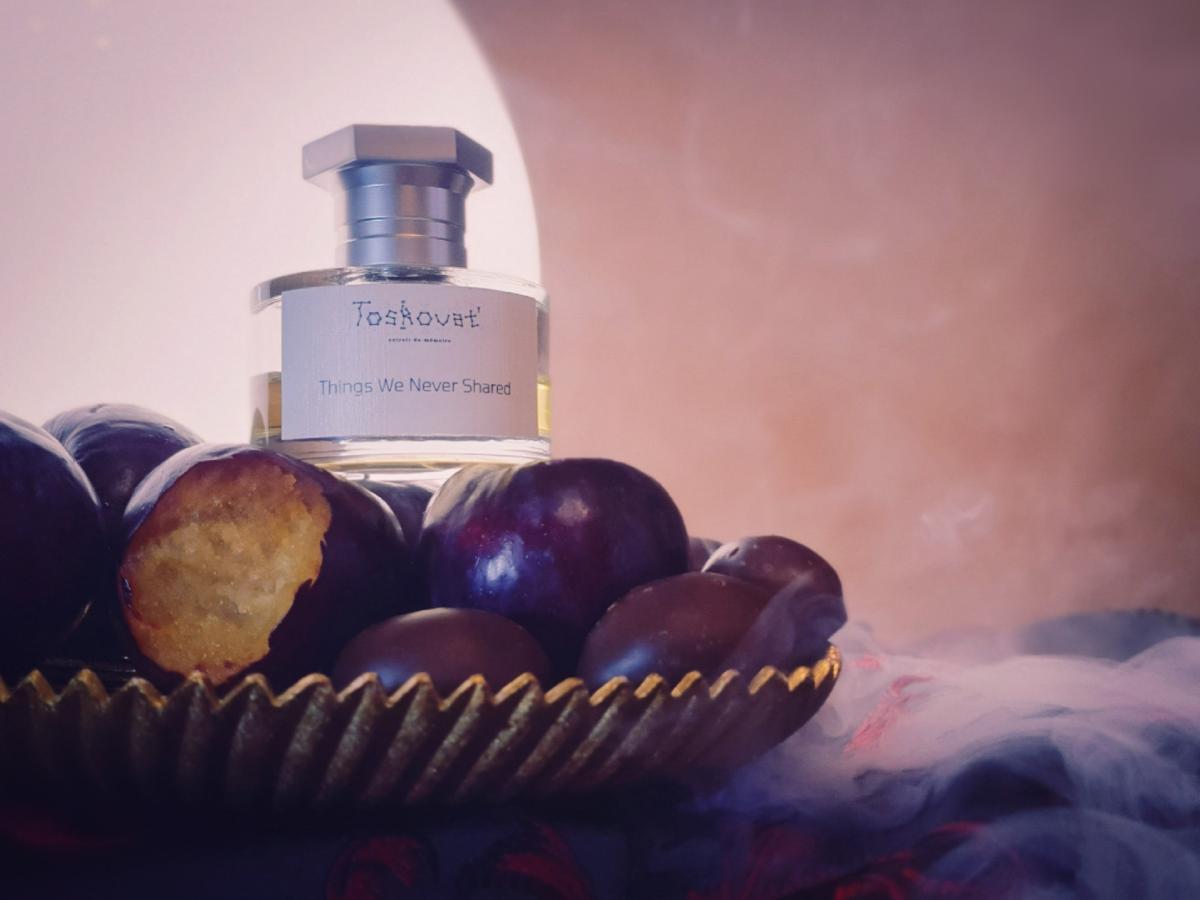 Things We Never Shared podle Toskovat' je Aromatic vůně pro ženy a muže. Things We Never Shared byl/a uveden/a v roce 2022. "Nosem" za touto vůní je David-Lev Jipa-Slivinschi. Vrchní tóny jsou Svařené víno, Advocaat, Mandarinka, Narcis a Hyacint; střední tóny jsouŠvestka, Panettone, Jed, Sacherův dort, Med, Makronky, Croissant, Kandované mandle, Černý rybíz a Pomeranč ; základní tóny jsou Kakao, Krém na ruce, Mléko, Karamela, Tabák, Jedle balzámová, Myrha, Santalové dřevo, Ebenové dřevo, Nard a Sněženky.