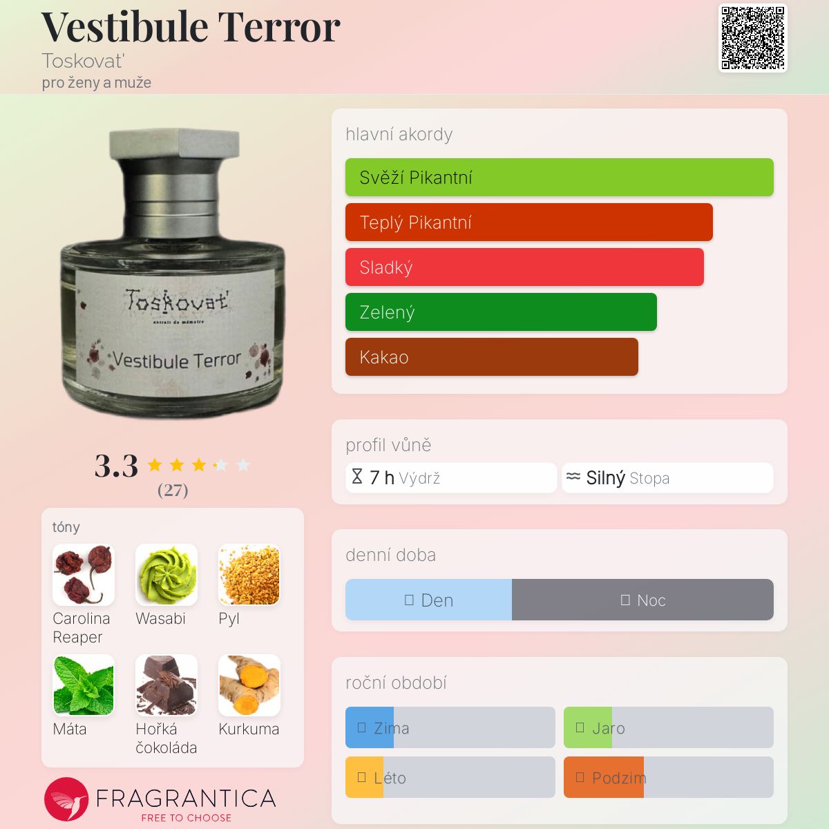 Vestibule Terror podle Toskovat' je vůně pro ženy a muže. Toto je nová vůně. Vestibule Terror byl/a uveden/a v roce 2025. "Nosem" za touto vůní je David-Lev Jipa-Slivinschi.