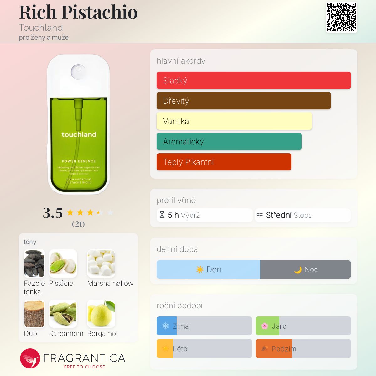 Rich Pistachio podle Touchland je Orientální Woody vůně pro ženy a muže. Toto je nová vůně. Rich Pistachio byl/a uveden/a v roce 2025. Vrchní tóny jsou Kardamom a Bergamot; střední tóny jsouPistácie a Marshmallow ; základní tóny jsou Fazole tonka a Dub.