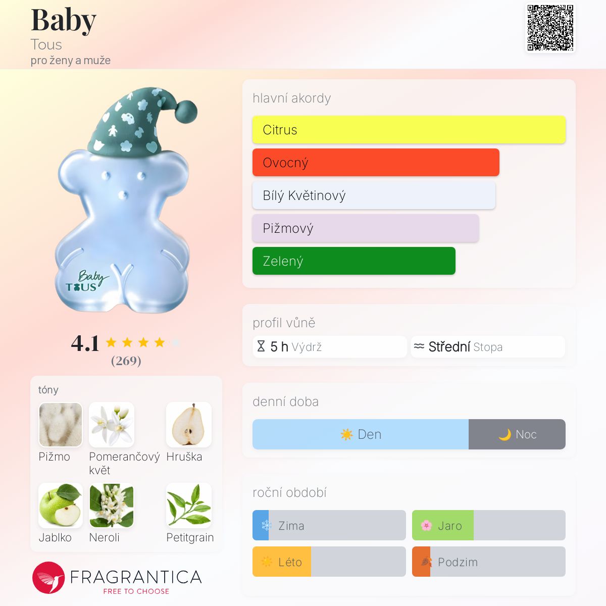 Baby podle Tous je Floral Fruity vůně pro ženy a muže. Baby byl/a uveden/a v roce 2007. Baby byl/a vytvořen/a Shyamala Maisondieu a Michel Girard. Vrchní tóny jsou Neroli, Mandarinka a Bergamot; střední tóny jsouPomerančový květ, Hruška, Jablko a Růže ; základní tóny jsou Pižmo, Petitgrain a Cedr.