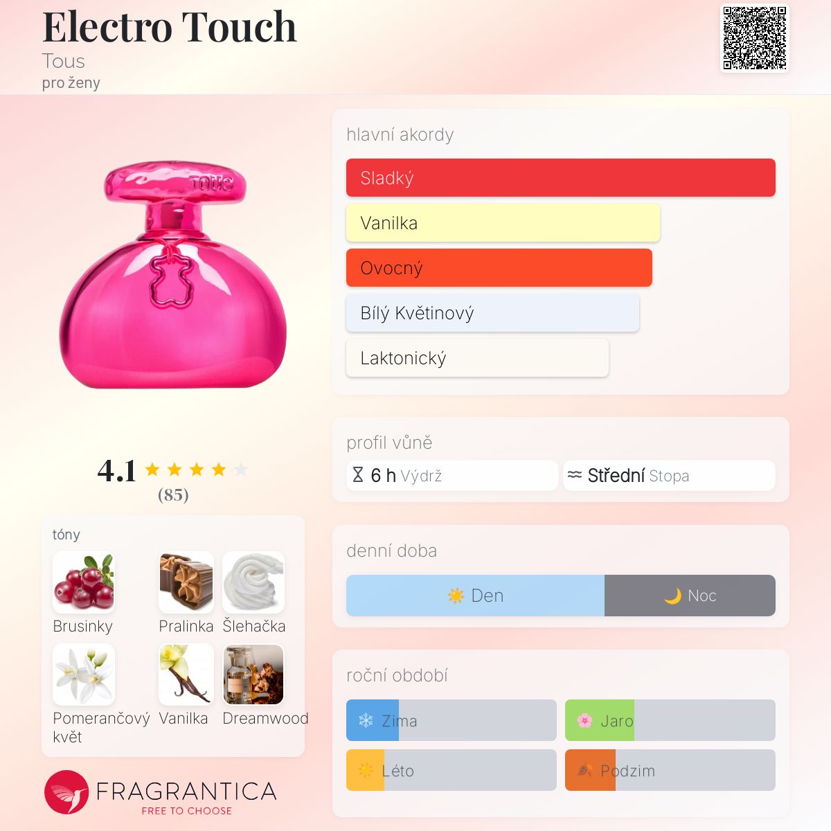 Electro Touch podle Tous je Floral Fruity vůně pro ženy. Toto je nová vůně. Electro Touch byl/a uveden/a v roce 2024. "Nosem" za touto vůní je Fabrice Pellegrin. Vrchní tóny jsou Brusinky, Hruška a Grapefruit; střední tóny jsouŠlehačka, Pomerančový květ a Jasmín ; základní tóny jsou Pralinka, Vanilka, Dreamwood a Santalové dřevo.