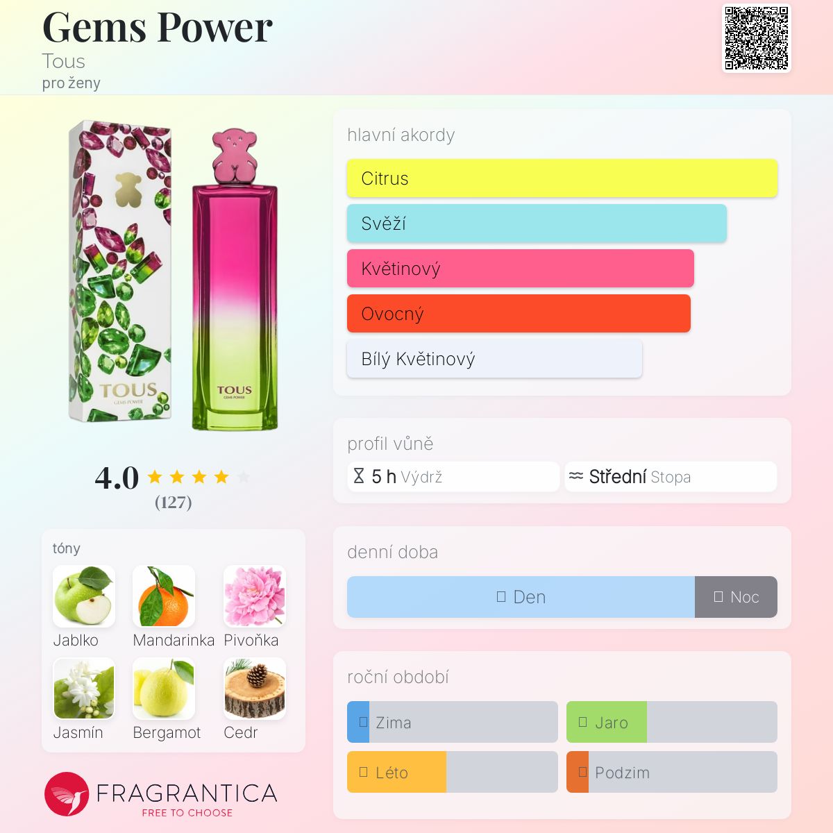 Gems Power podle Tous je Floral Fruity vůně pro ženy. Gems Power byl/a uveden/a v roce 2019. Vrchní tóny jsou Granny Smith jablko, Italská mandarinka a Sicilský bergamot; střední tóny jsouPivoňka a Jasmín Sambac ; základní tóny jsou Atlasový cedr, Jantar (ambra) a Vanilka.