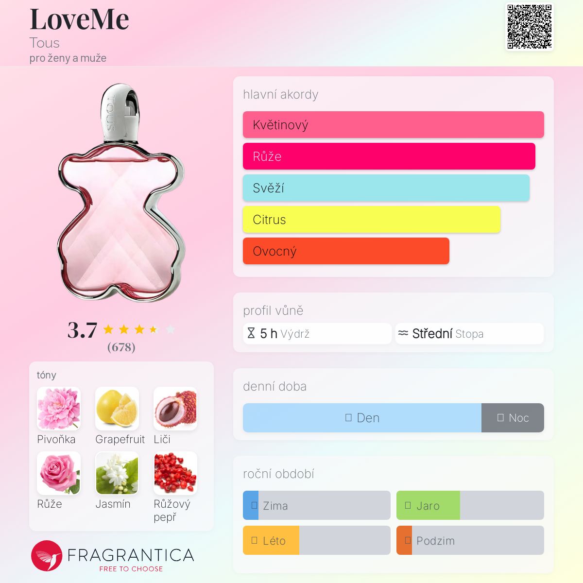 LoveMe podle Tous je Floral Fruity vůně pro ženy a muže. LoveMe byl/a uveden/a v roce 2020. "Nosem" za touto vůní je Olivier Cresp. Vrchní tóny jsou Růžový grapefruit, Růžové liči a Růžový pepř; střední tóny jsouPivoňka, Damašská růže a Jasmín ; základní tóny jsou Cedr, Mech a Kašmírové dřevo.