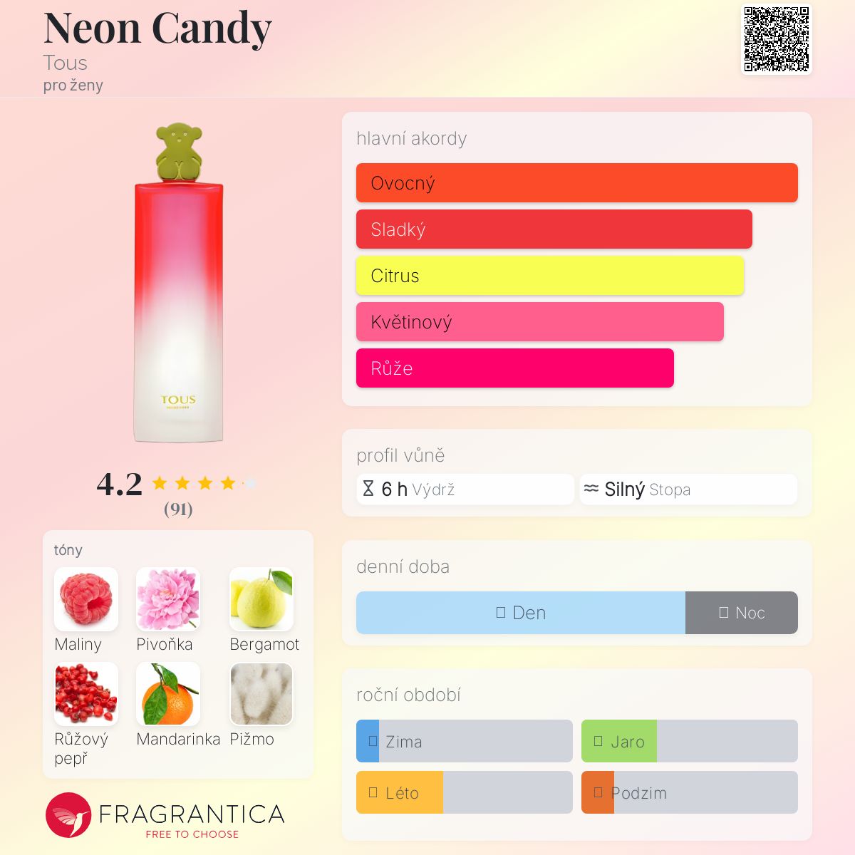 Neon Candy podle Tous je Floral Woody Musk vůně pro ženy. Neon Candy byl/a uveden/a v roce 2015. "Nosem" za touto vůní je Nathalie Lorson. Vrchní tóny jsou Bergamot, Růžový pepř a Mandarinka; střední tóny jsouMaliny, Pivoňka a Jasmín ; základní tóny jsou Pižmo, Cedr a Jantar (ambra).