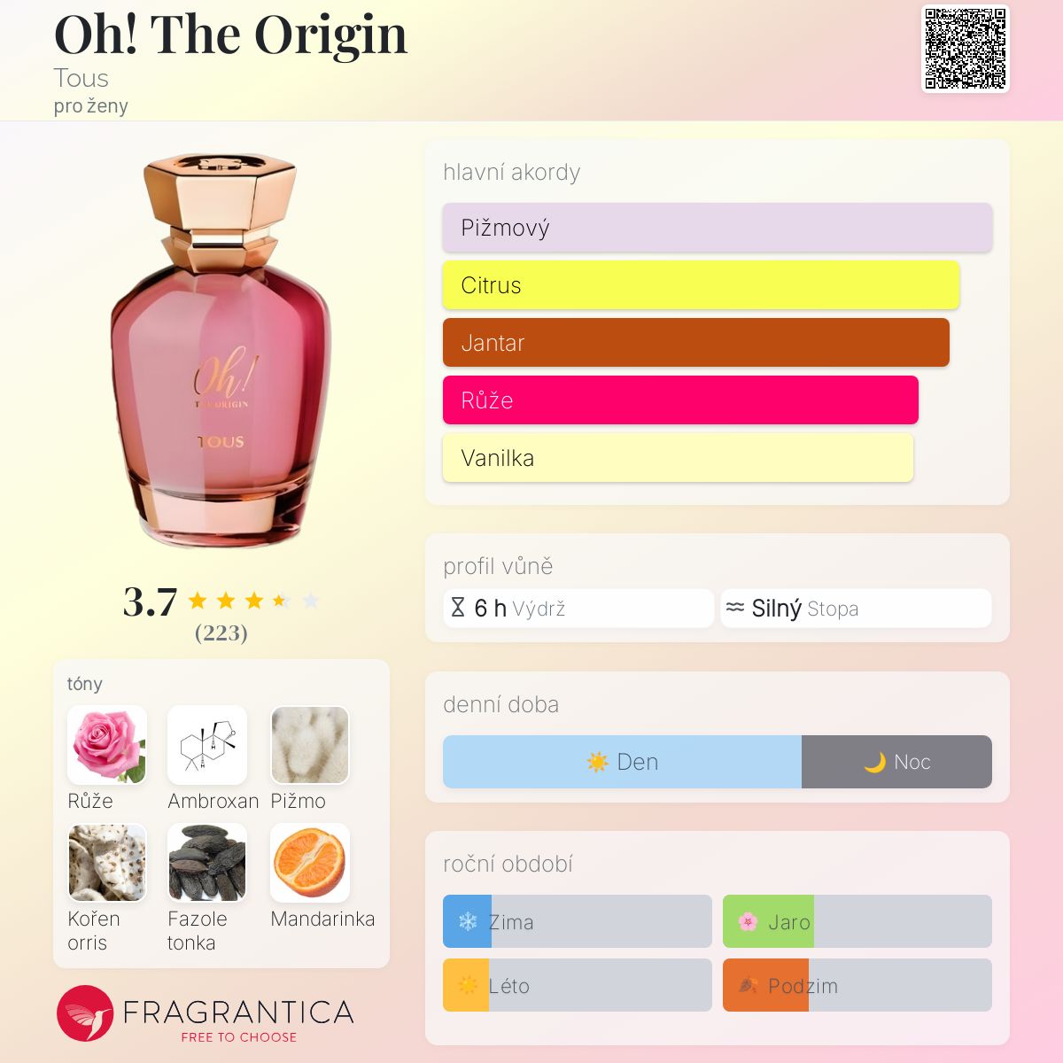 Oh! The Origin podle Tous je Floral Fruity vůně pro ženy. Oh! The Origin byl/a uveden/a v roce 2018. "Nosem" za touto vůní je Daphné Bugey. Vrchní tóny jsou Mandarinka, Citrón, Černý rybíz a Růžový pepř; střední tóny jsouRůže a Orris ; základní tóny jsou Ambroxan, Pižmo, Fazole tonka a Vanilka.