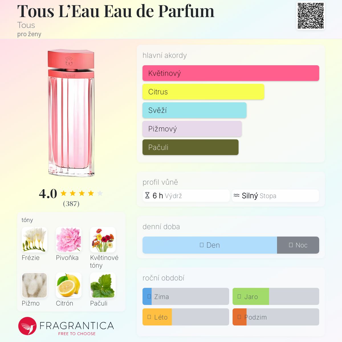 Tous L’Eau Eau de Parfum podle Tous je Floral Woody Musk vůně pro ženy. Tous L’Eau Eau de Parfum byl/a uveden/a v roce 2011. "Nosem" za touto vůní je Nathalie Lorson. Vrchní tóny jsou Květinové tóny, Citron amalfi a Mandarinka; střední tóny jsouFrézie, Pivoňka, Jasmín a Černý rybíz ; základní tóny jsou Pižmo, Pačuli a Jantar (ambra).