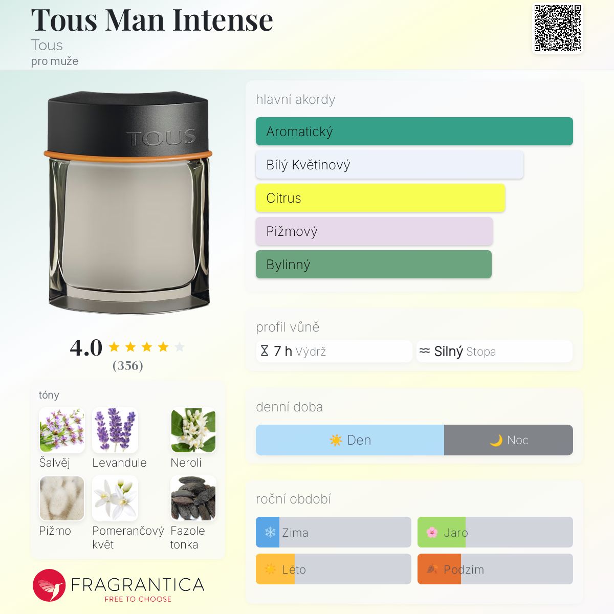 Tous Man Intense podle Tous je Aromatic Fougere vůně pro muže. Tous Man Intense byl/a uveden/a v roce 2013. Tous Man Intense byl/a vytvořen/a Alienor Massenet a Pierre Wargnye. Vrchní tóny jsou Šalvěj, Neroli a Petitgrain; střední tóny jsouŠalvěj, Levandule a Tuniský pomerančový květ ; základní tóny jsou Pižmo, Fazole tonka, Mech a Jantar (ambra).