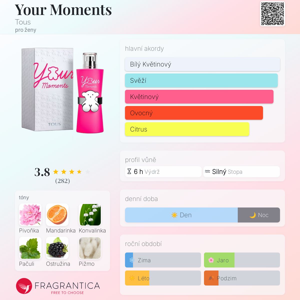 Your Moments podle Tous je Chypre Floral vůně pro ženy. Your Moments byl/a uveden/a v roce 2018. Your Moments byl/a vytvořen/a Veronique Nyberg a Violaine Collas. Vrchní tóny jsou Mandarinka, Ostružina, Kardamom a Meruňka; střední tóny jsouPivoňka, Konvalinka a Jasmín ; základní tóny jsou Pačuli a Bílé pižmo.