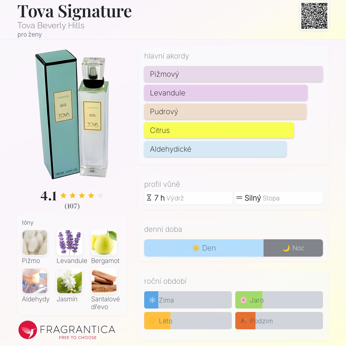 Tova Signature podle Tova Beverly Hills je Floral Woody Musk vůně pro ženy. Tova Signature byl/a uveden/a v roce 1983. Vrchní tóny jsou Bergamot a Aldehydy; střední tóny jsouLevandule a Jasmín ; základní tóny jsou Pižmo, Santalové dřevo a Jantar (ambra).