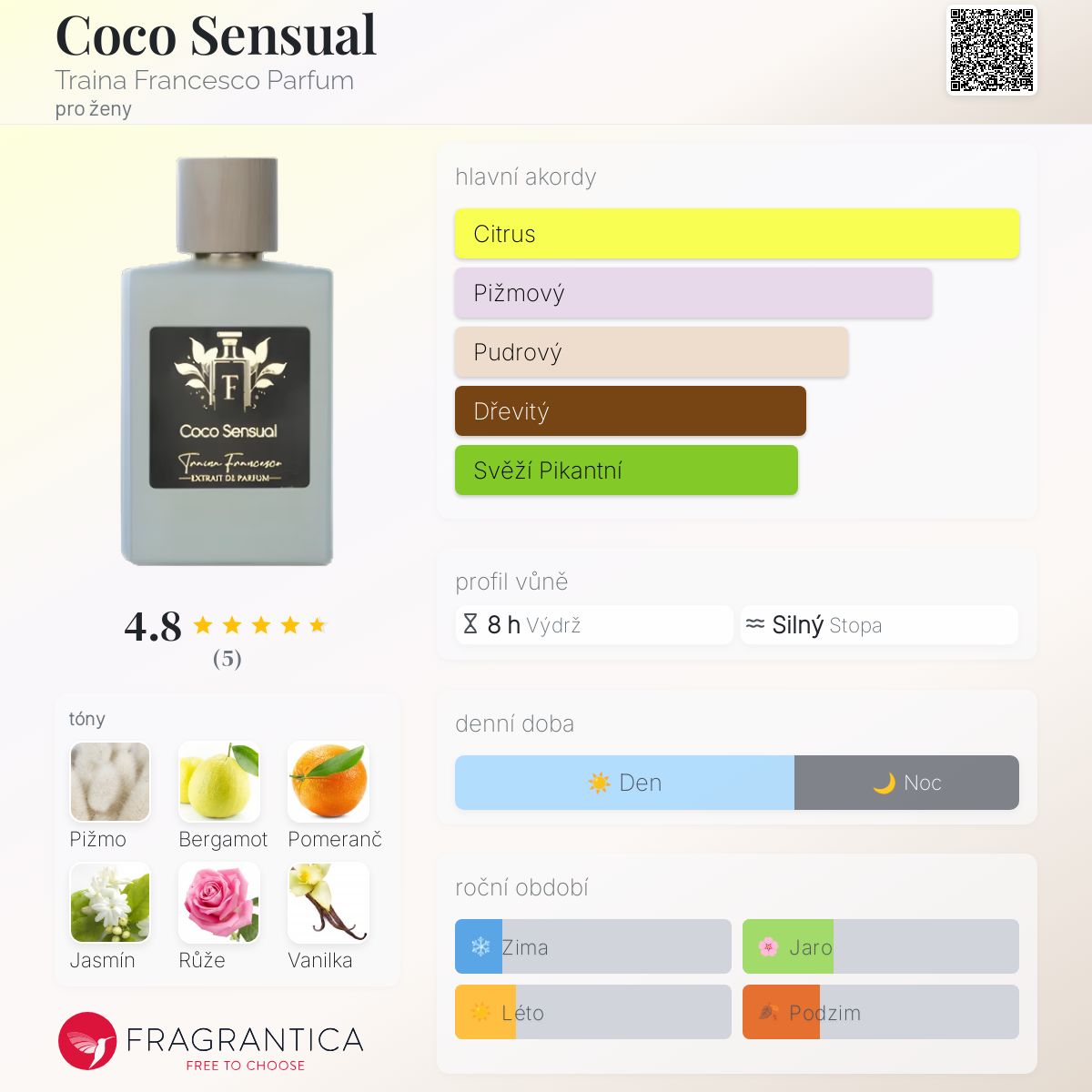 Coco Sensual podle Traina Francesco Parfum je vůně pro ženy. Toto je nová vůně. Coco Sensual byl/a uveden/a v roce 2023. Vrchní tóny jsou Kalábrijský bergamot a Sicilský pomeranč; střední tóny jsouJasmín a Růže ; základní tóny jsou Bílé pižmo, Bourbonská vanilka, Pačuli a Vetiver.
