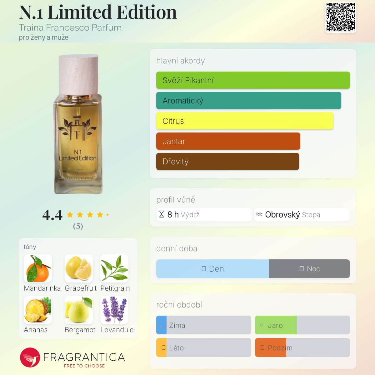 N.1 Limited Edition podle Traina Francesco Parfum je vůně pro ženy a muže. Toto je nová vůně. N.1 Limited Edition byl/a uveden/a v roce 2023. Vrchní tóny jsou Mandarinka, Grapefruit, Petitgrain, Ananas, Bergamot, Levandule, Rozmarýn, Galbanum, Pepř, Muškátový oříšek, Broskev a Limetka; střední tóny jsouŠalvěj muškátová, Brambořík, Jasmín, Frézie a Aksamitník ; základní tóny jsou Francouzské labdanum, Virginský cedr, Pačuli, Olibanum, Jantar (ambra) a Pižmo.