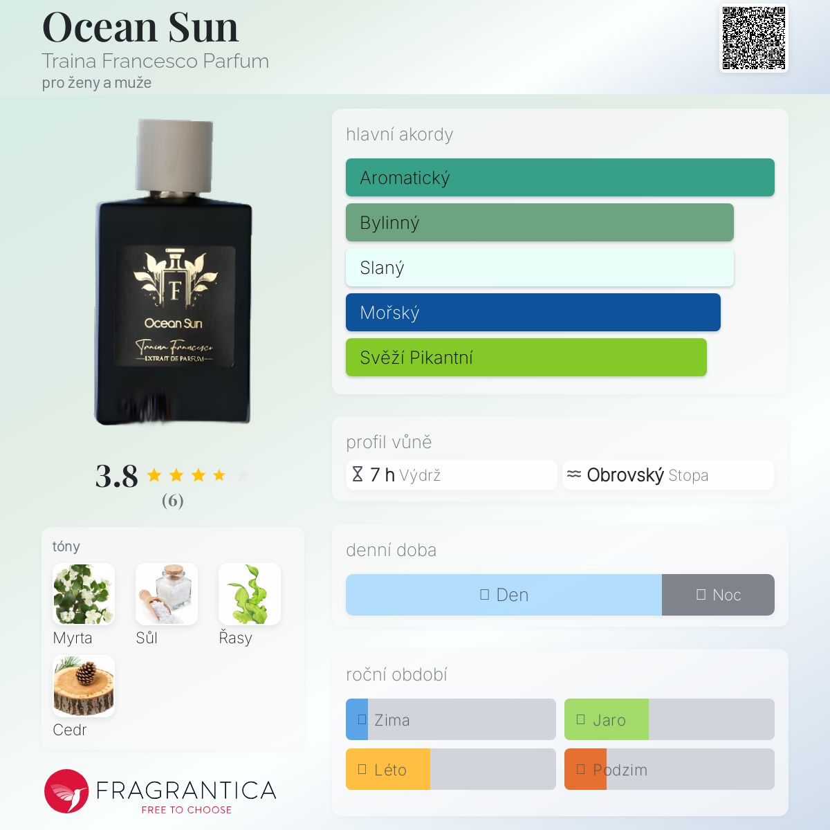 Ocean Sun podle Traina Francesco Parfum je vůně pro ženy a muže. Ocean Sun byl/a uveden/a v roce 2023. Vrchní tóny jsou Myrta a Sůl; střední tón jeŘasy ; základní tón je Virginský cedr.