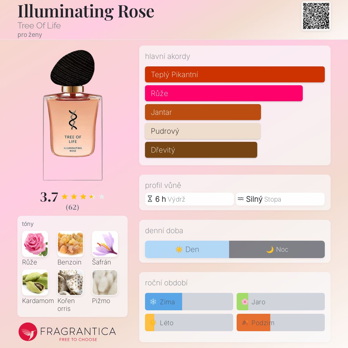 Illuminating Rose podle Tree Of Life je Orientální Floral vůně pro ženy. Illuminating Rose byl/a uveden/a v roce 2023. "Nosem" za touto vůní je Soizic Beaucourt. Vrchní tóny jsou Růže, Kardamom a Bergamot; střední tóny jsouBenzoin, Šafrán, Kořen orris a Shamama Attar ; základní tóny jsou Pižmo, Santalové dřevo a Pačuli.